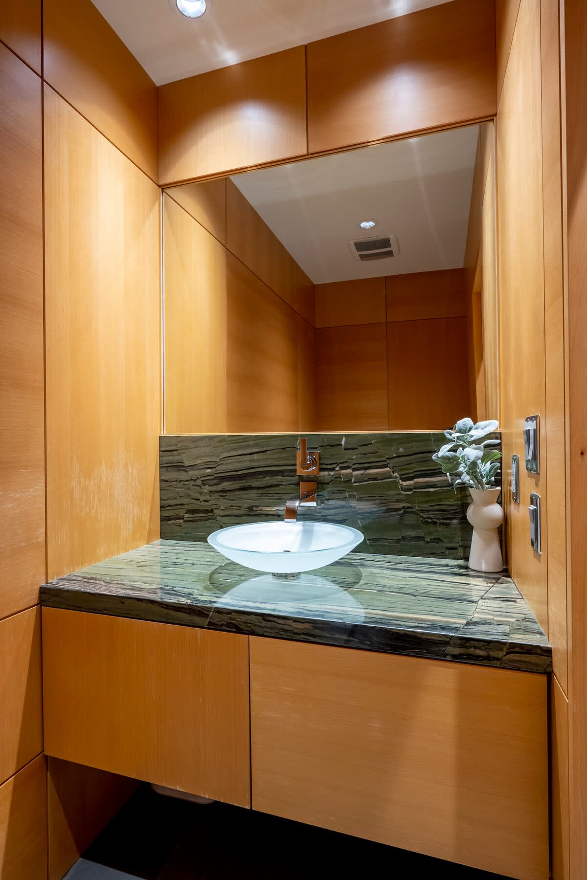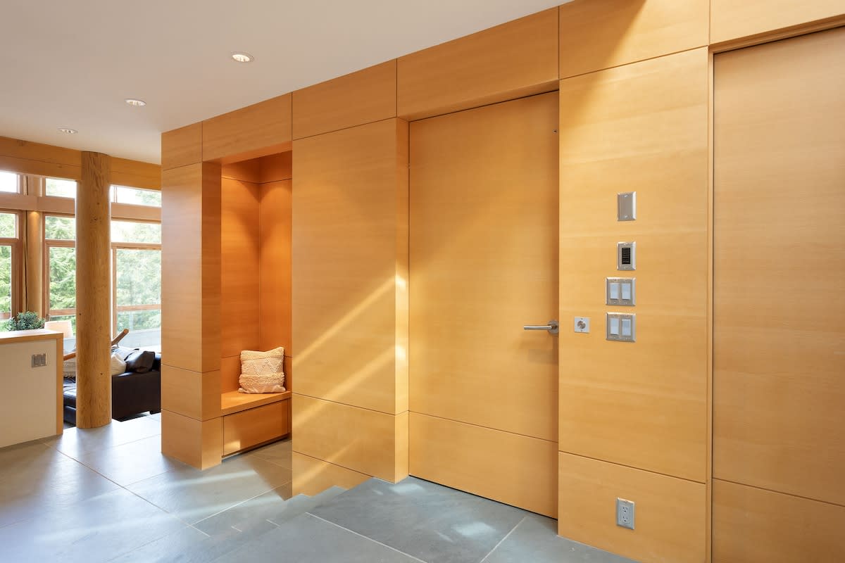 The home spans three levels within Blueberry Estates, connected by an elevator that makes moving between floors effortless. On the main level, an open-concept living area is wrapped in floor-to-ceiling windows, allowing the winter landscape to remain front and center throughout the day. Slide open the doors for fresh mountain air or settle in after dark as the space becomes a natural hub for conversation and downtime. A powder room on this level adds everyday convenience.