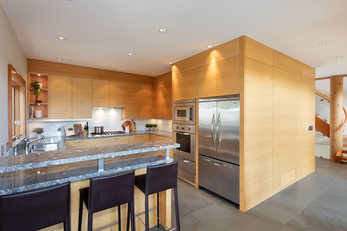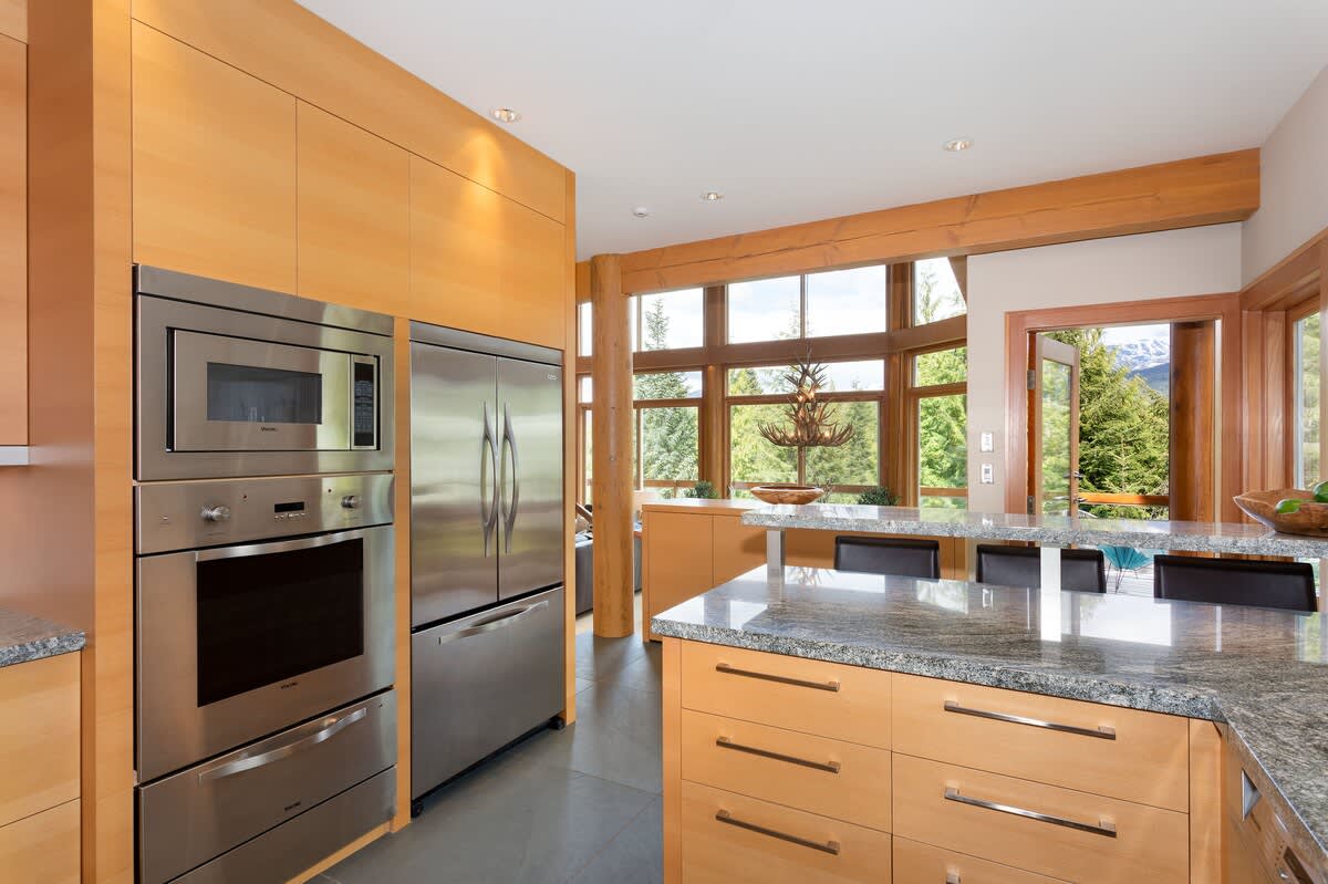 The kitchen is set up for shared meals and slow mornings, with granite counters, custom cabinetry, and full-size appliances. A breakfast bar seats three for casual starts to the day, while the adjacent dining table seats eight and brings everyone together after time outdoors. Whether you’re preparing a full dinner or warming up something simple, the layout keeps the group connected.