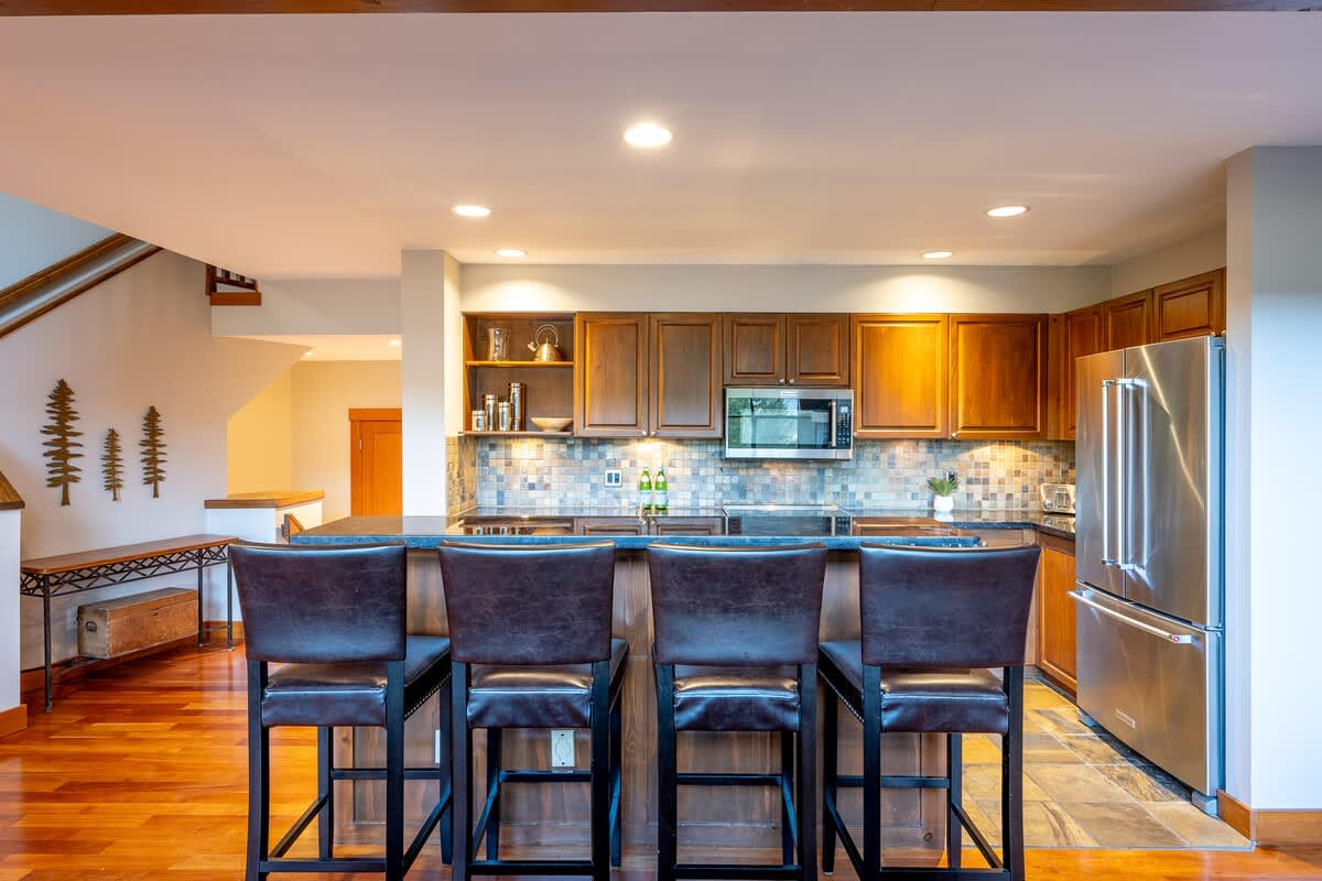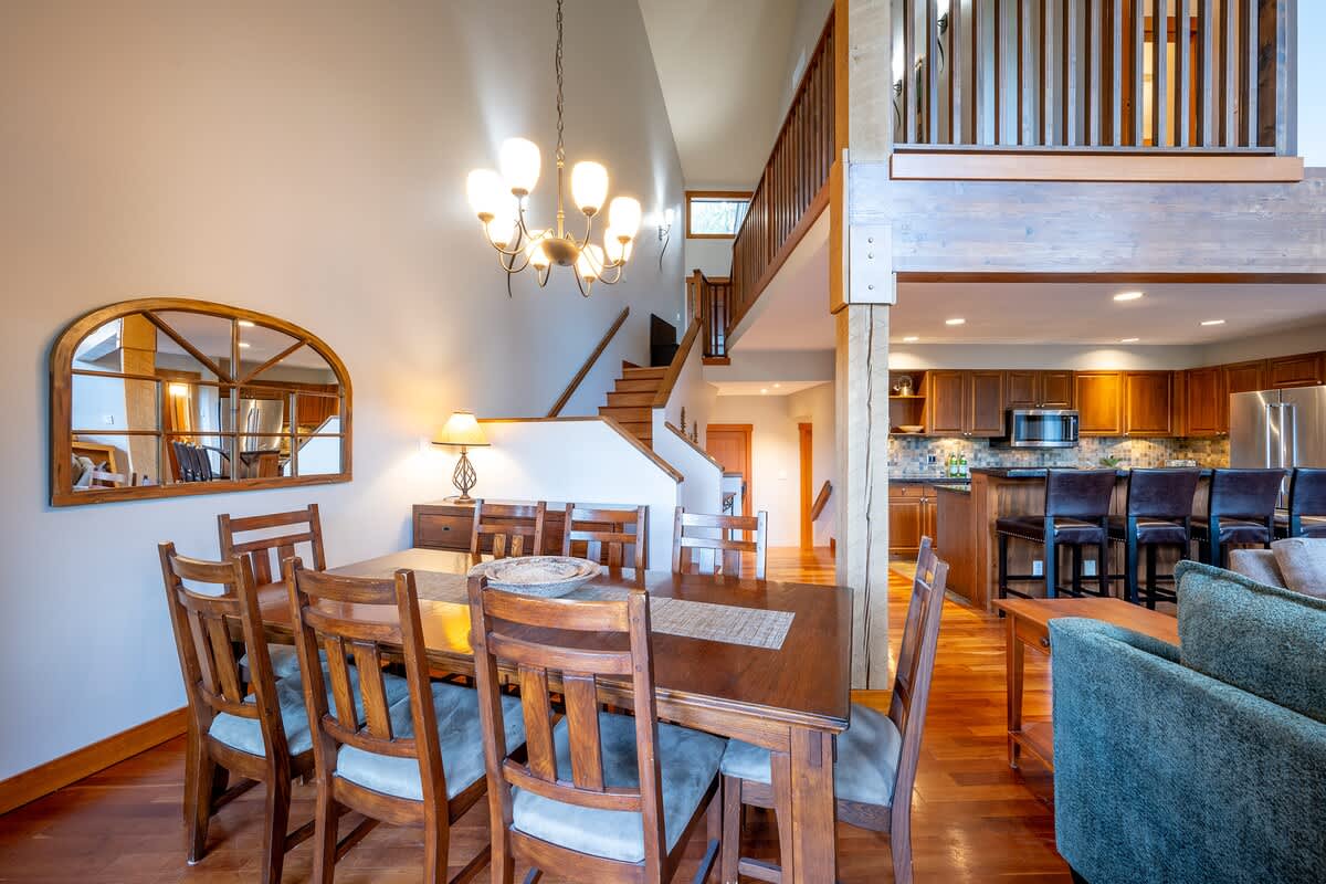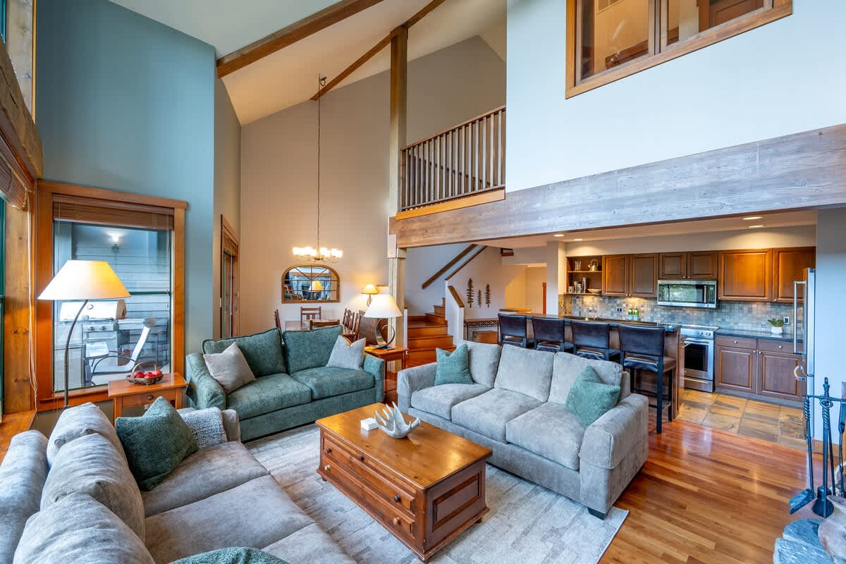 Multiple levels create natural gathering spots, with the main living area centered around vaulted ceilings, generous windows, and the wood-burning fireplace that anchors nights after the slopes. The dining area seats eight with additional space at the breakfast bar, offering an easy flow for shared meals. A full kitchen supports home cooking, and a dedicated workspace with a desk allows you to check in when needed. Heating, air conditioning, portable fans, and an indoor fireplace maintain comfort throughout the seasons.