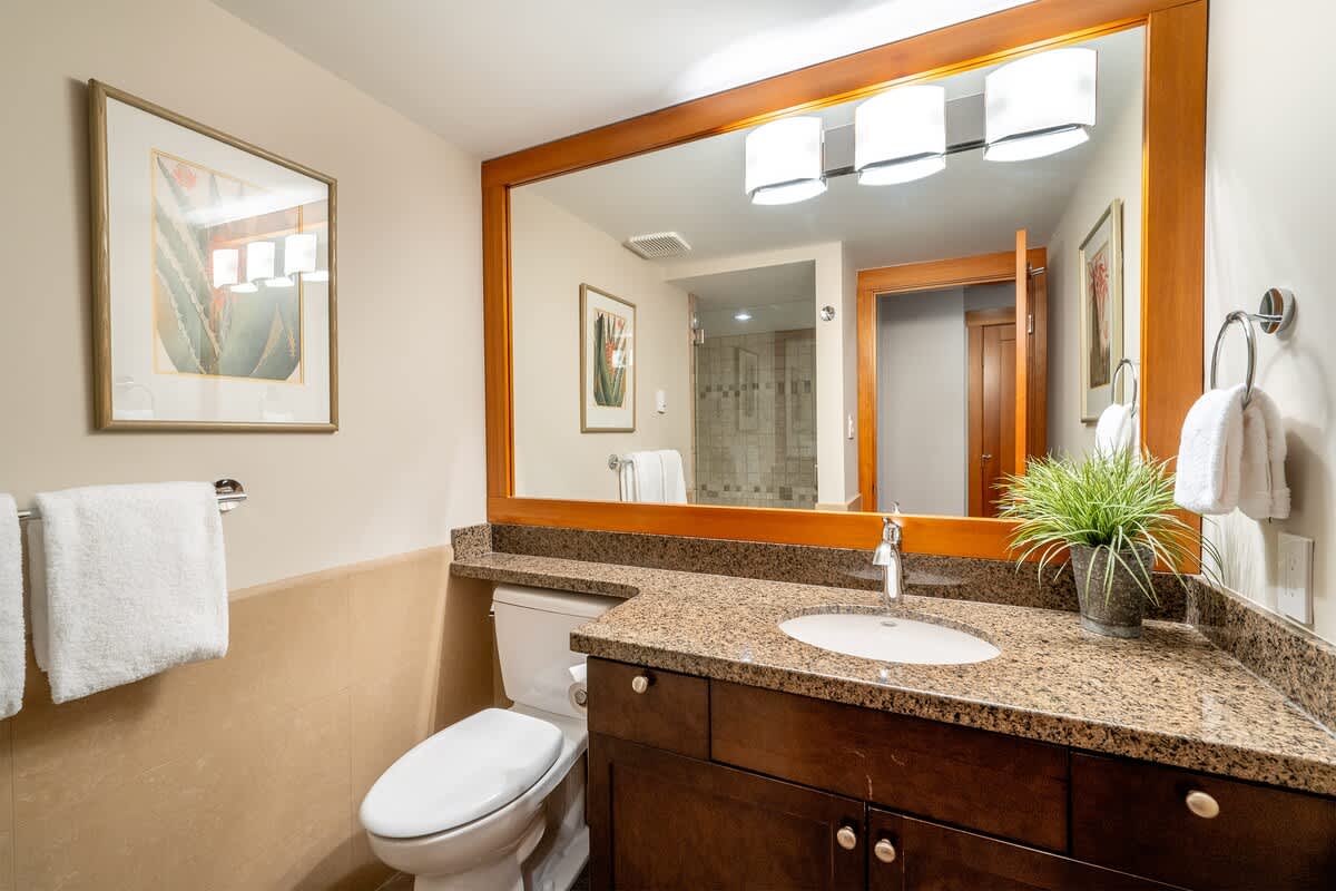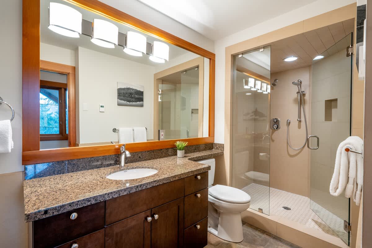 Ten guests can settle in across four bedrooms and a den. The upper-level primary bedroom features a king-split bed, TV, and ensuite with a glass-enclosed shower and deep soaking tub. Another king-split bedroom sits on the main level with a nearby bathroom. On the lower floor, one bedroom includes a queen bed and another offers two twin bunk beds, each room equipped with a TV. Two additional bathrooms on this level include both a shower-only layout and a bathtub-shower combination. Essentials, bed linens, extra pillows and blankets, and in-unit laundry support longer winter stays.