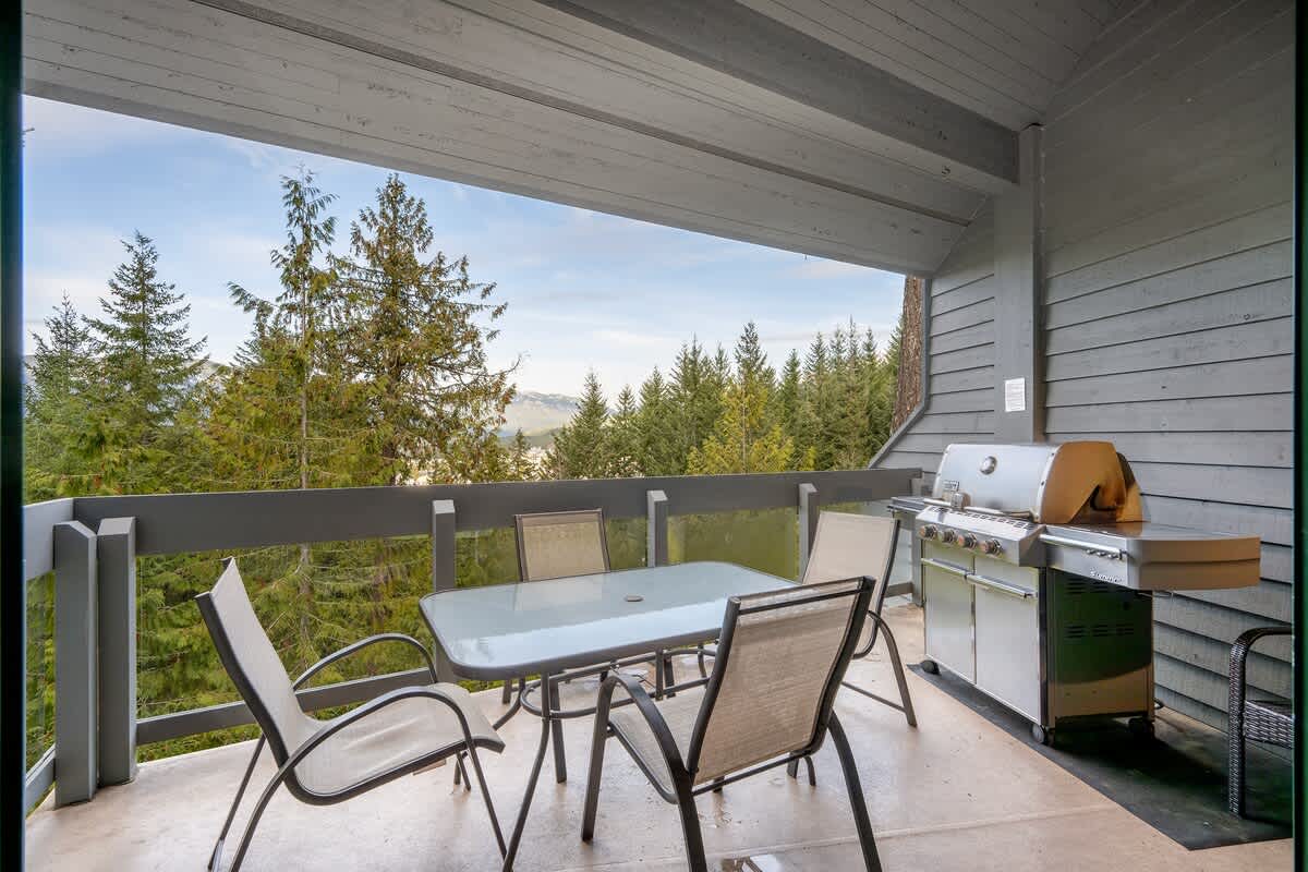 The forest backdrop enhances the quiet of colder months, especially when you step onto the deck to use the BBQ grill or slip into the private hot tub surrounded by trees. The single-car garage includes boot warmers and space for ski and snowboard storage, keeping gear ready for the next outing. Outdoor furniture on the patio or balcony provides another peaceful place to take in the crisp mountain air.