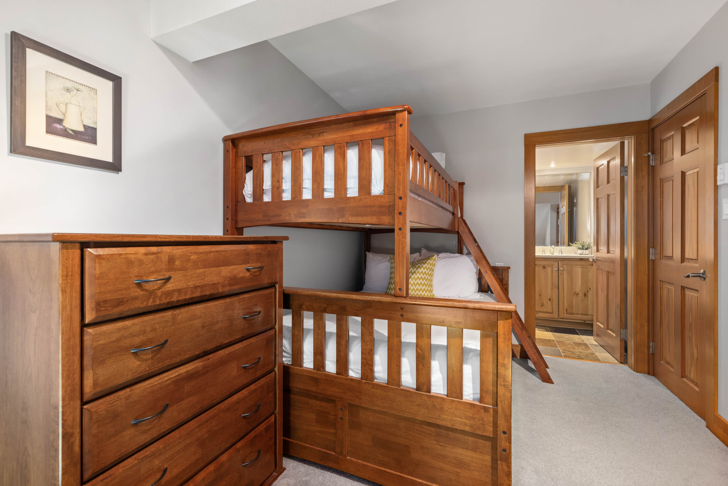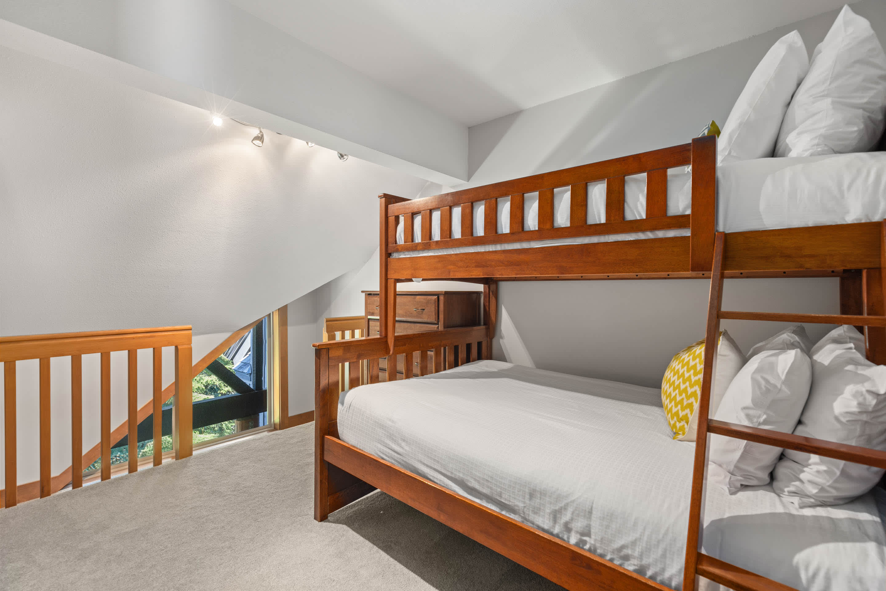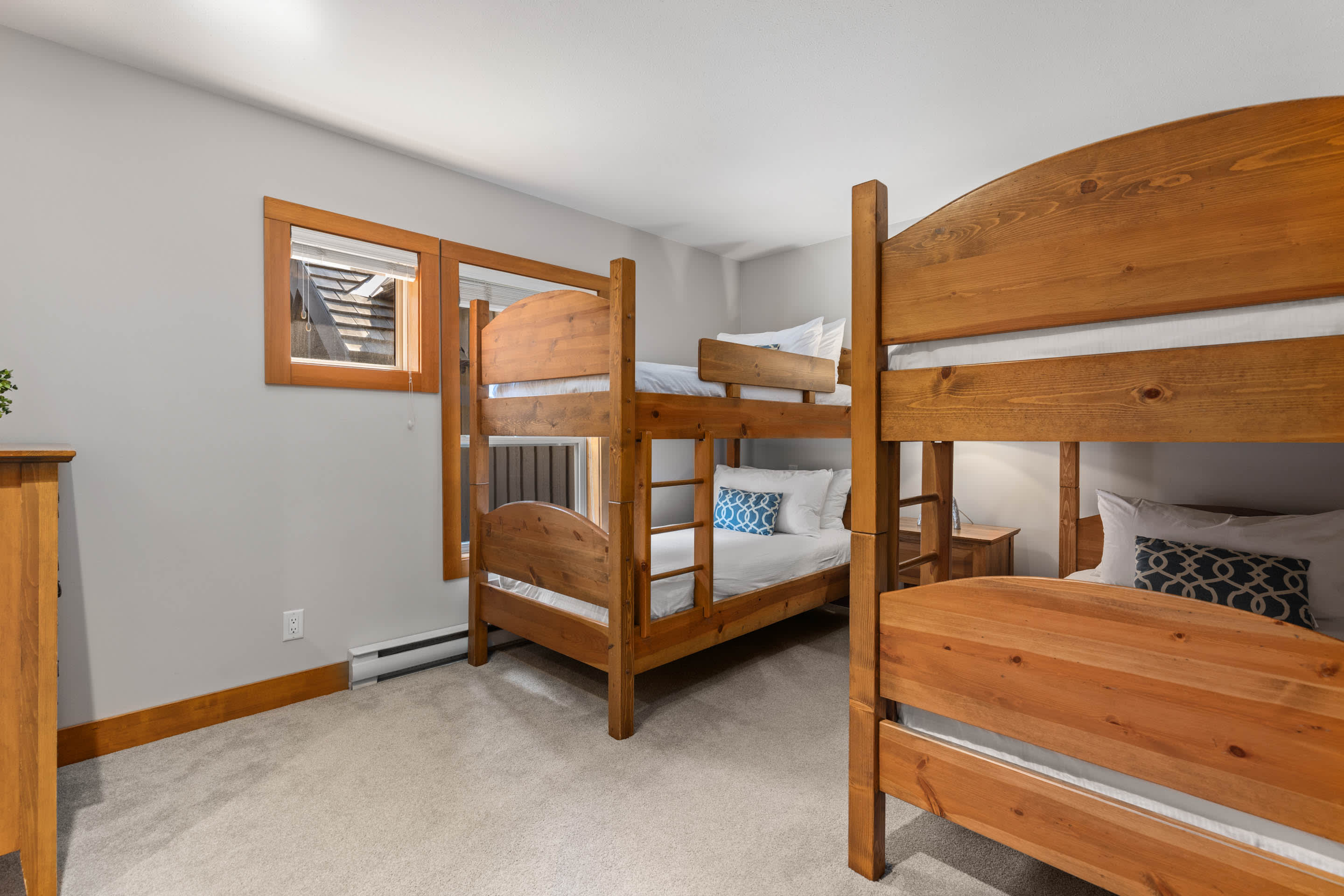 The upper-level primary bedroom features a queen bed, TV, walk-in closet, and direct access to a private deck overlooking the forest. Its ensuite includes a glass-enclosed shower and double vanity. On the main level, a secondary bedroom offers a tri-bunk bed and its own ensuite with a deep soaking bathtub and overhead shower. Another bedroom provides a king bed, dresser, closet, and TV with cable, while the fourth bedroom includes two sets of twin bunk beds with ample storage. An additional bathroom on the main level features a spacious glass-enclosed shower and single vanity.