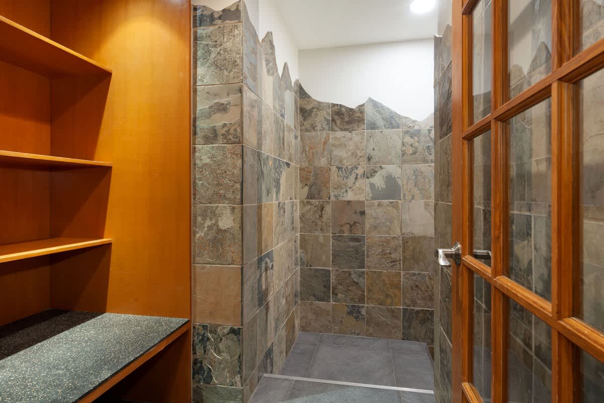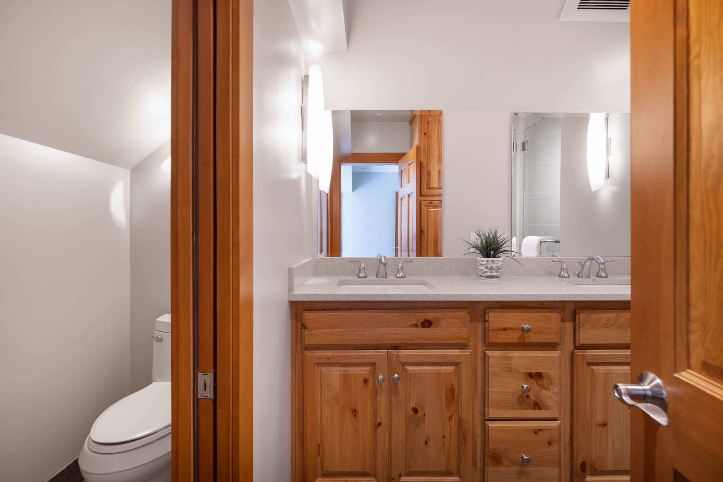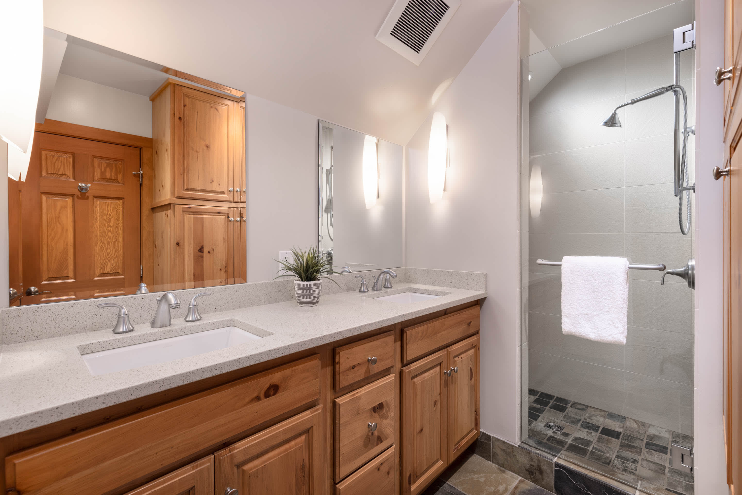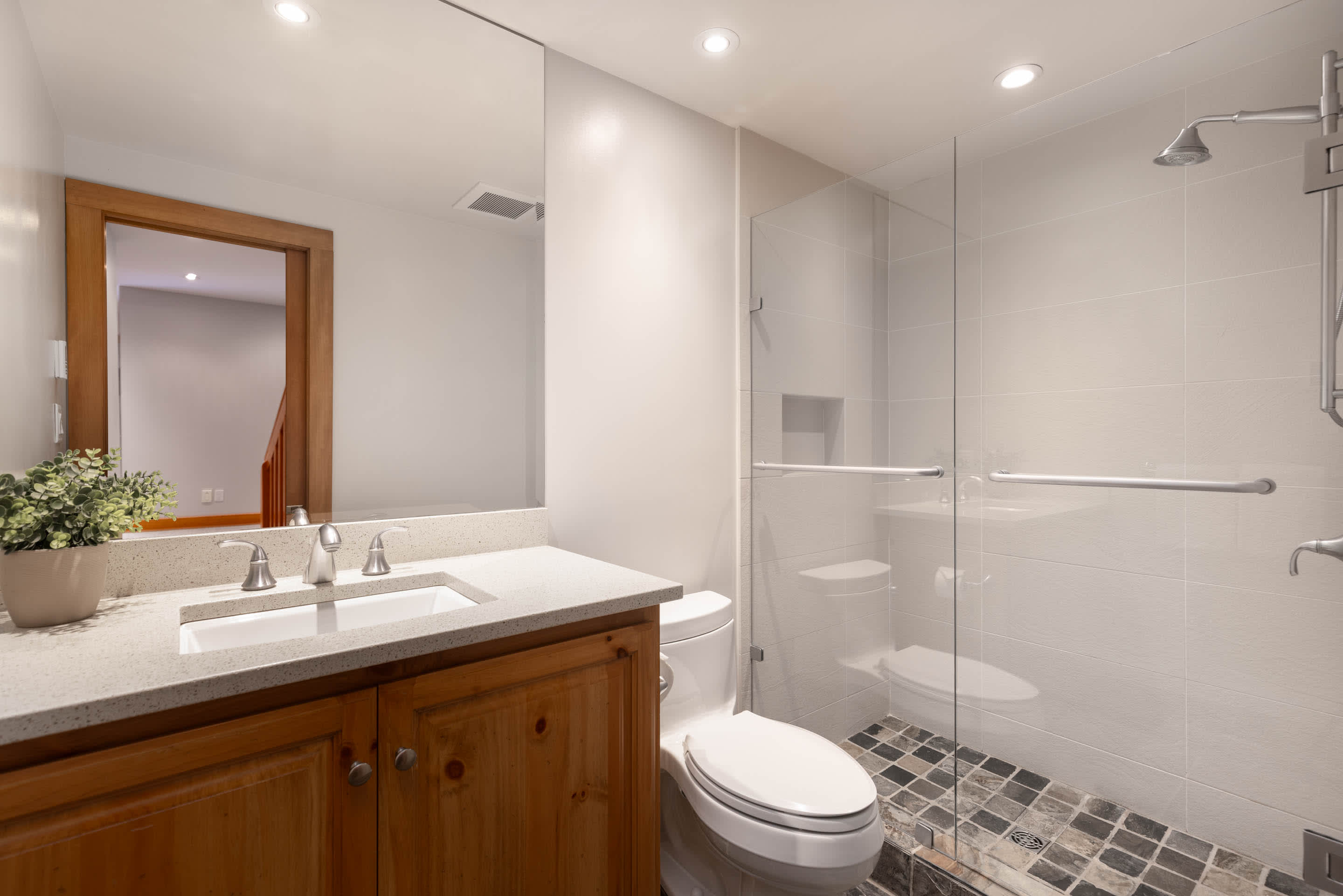 The upper-level primary bedroom features a queen bed, TV, walk-in closet, and direct access to a private deck overlooking the forest. Its ensuite includes a glass-enclosed shower and double vanity. On the main level, a secondary bedroom offers a tri-bunk bed and its own ensuite with a deep soaking bathtub and overhead shower. Another bedroom provides a king bed, dresser, closet, and TV with cable, while the fourth bedroom includes two sets of twin bunk beds with ample storage. An additional bathroom on the main level features a spacious glass-enclosed shower and single vanity.