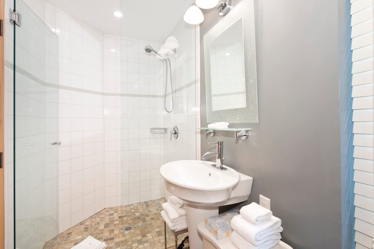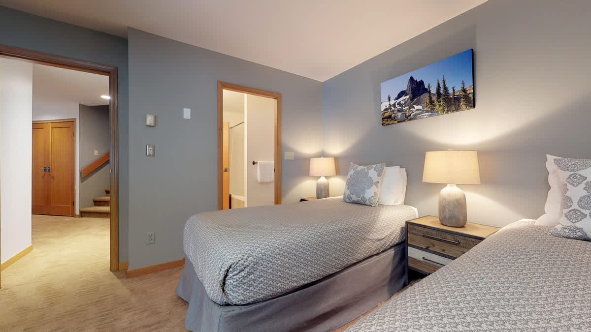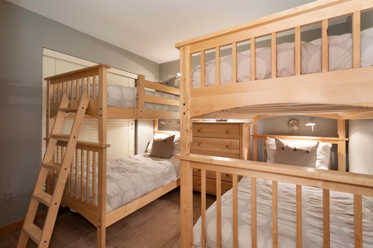 Designed to host up to ten guests, the townhouse includes four bedrooms, seven beds, and three and a half bathrooms across multiple levels. The upper-floor primary bedroom features a king bed, walk-in wardrobe, and an ensuite with heated floors, a deep soaking tub, a glass-enclosed shower, and double vanity. Downstairs, one bedroom offers a queen bed with its own ensuite, while another includes a king-split bed that can be arranged as twins, paired with an ensuite with a bathtub and shower. The fourth bedroom has two sets of bunk beds, well-suited for families or groups traveling together.