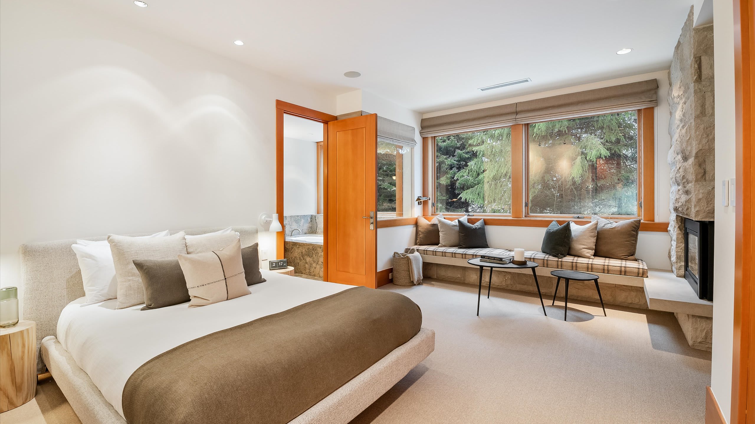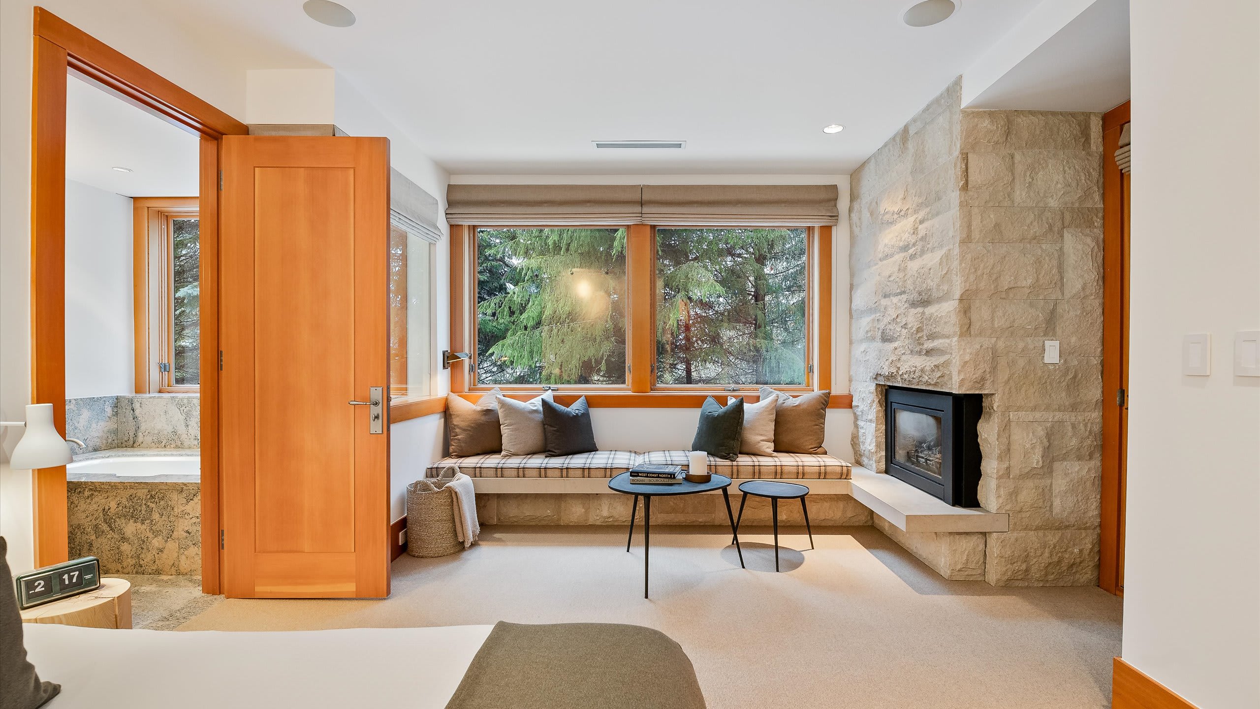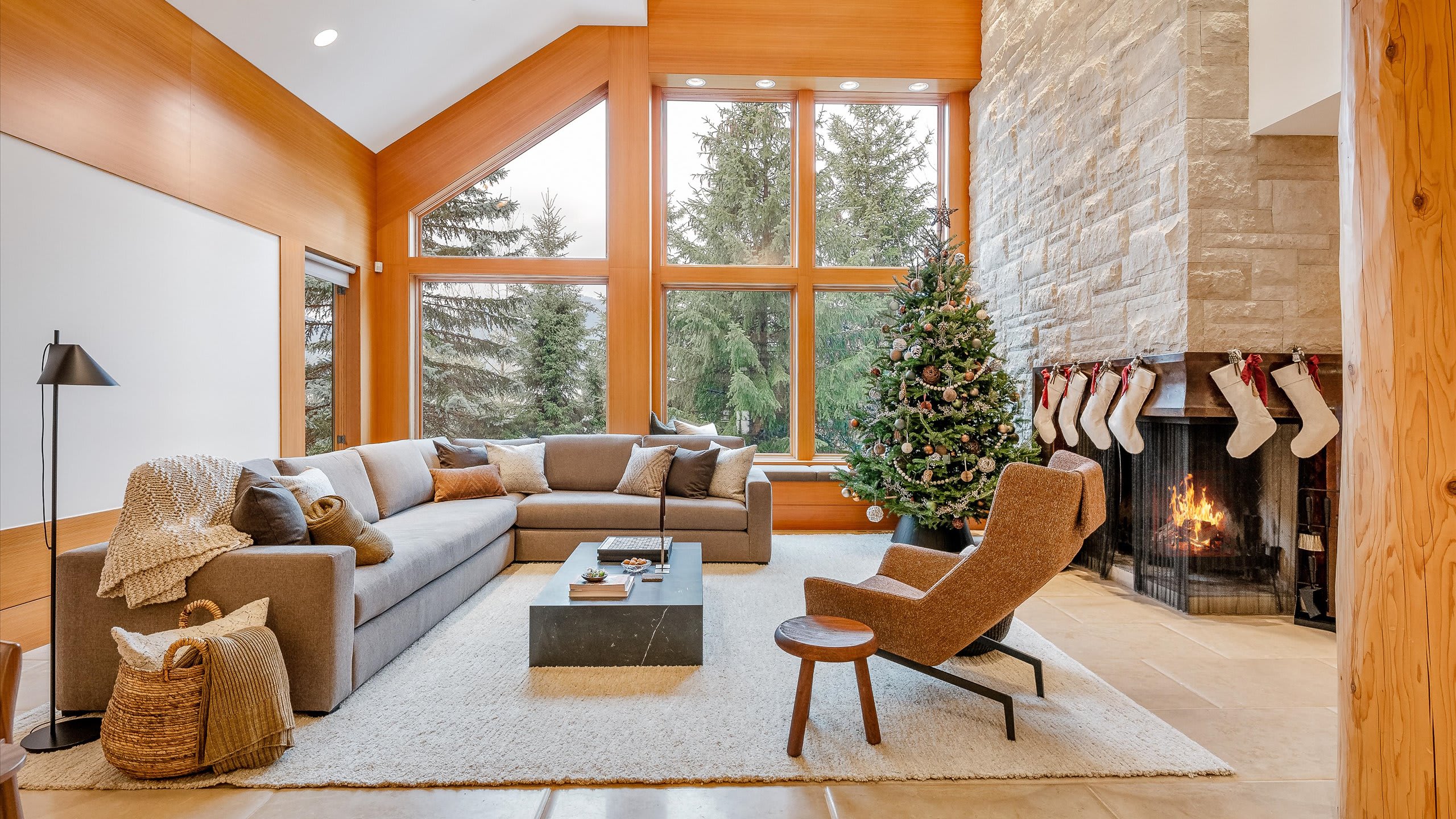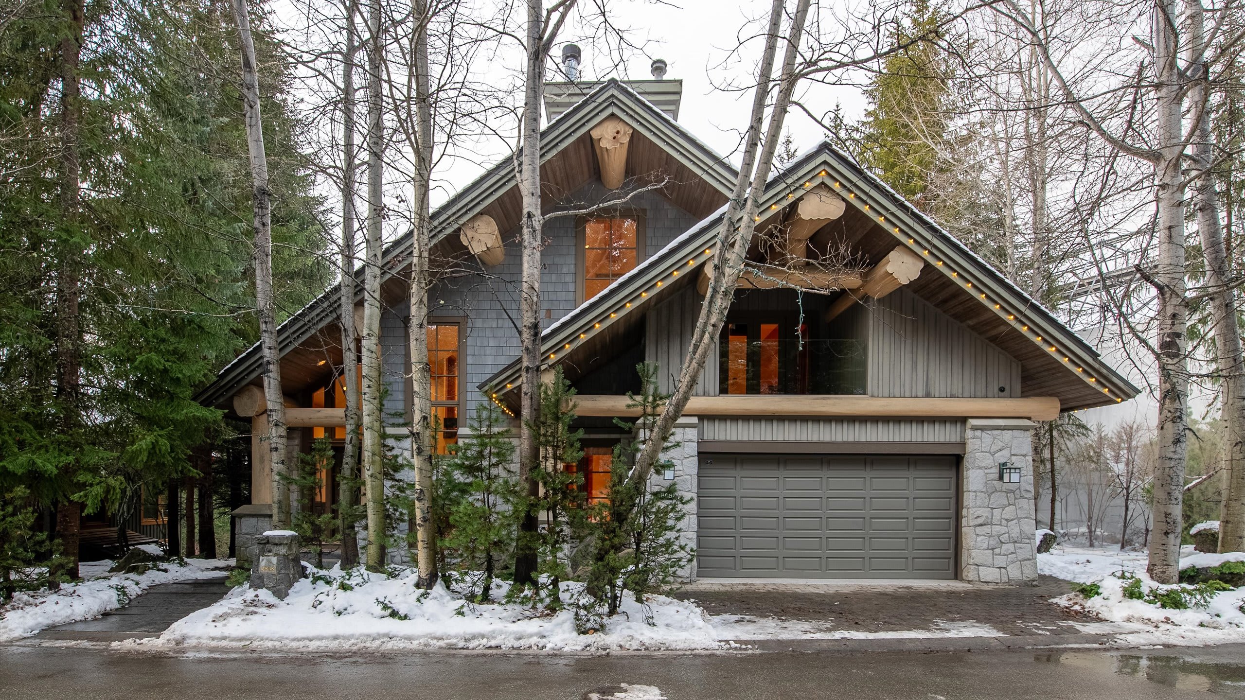 Spread across three levels, this standalone chalet balances shared gathering areas with moments of privacy. The open-plan main living area is centered around a striking stone fireplace and expansive windows framing the wilderness outside. A media room with a projector and gas fireplace offers another inviting place to relax after skiing, while the home’s heating, air conditioning, and portable fans provide comfort through every season.