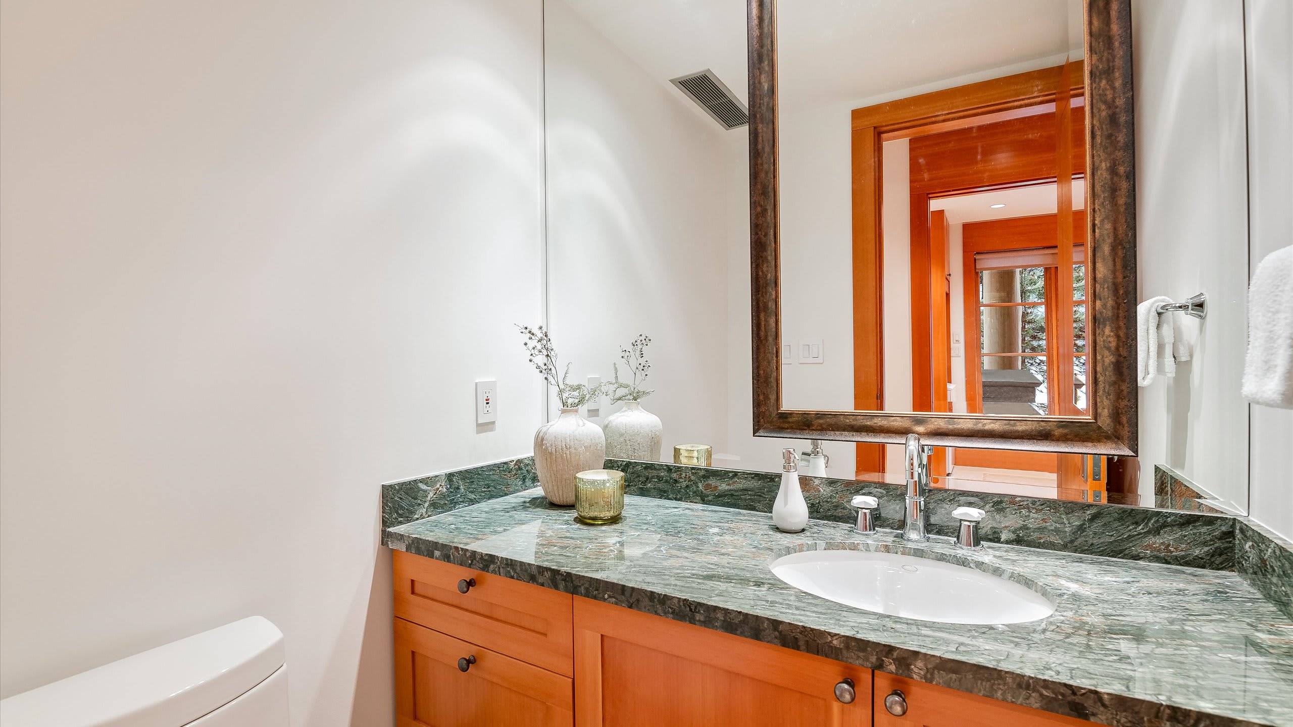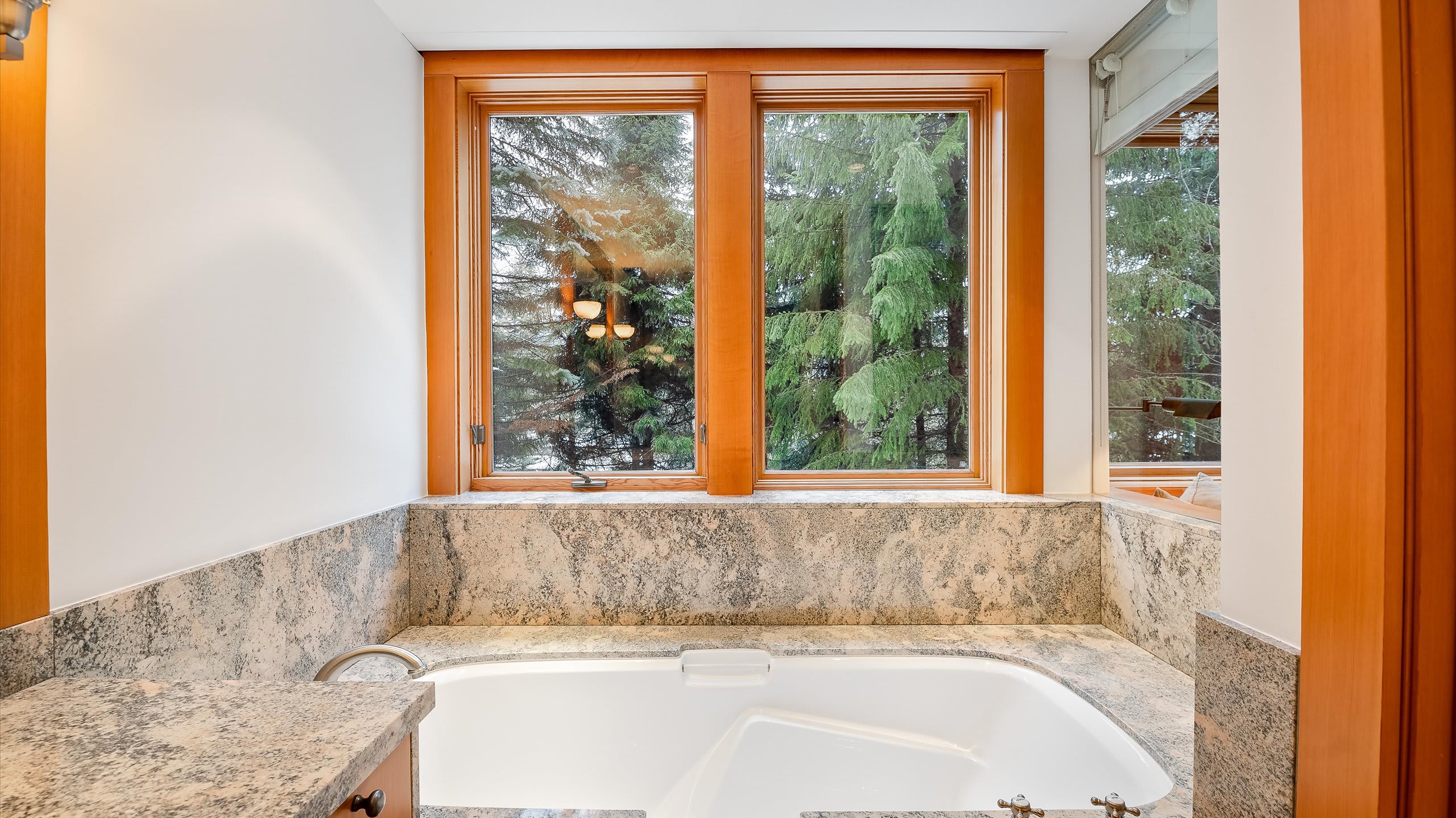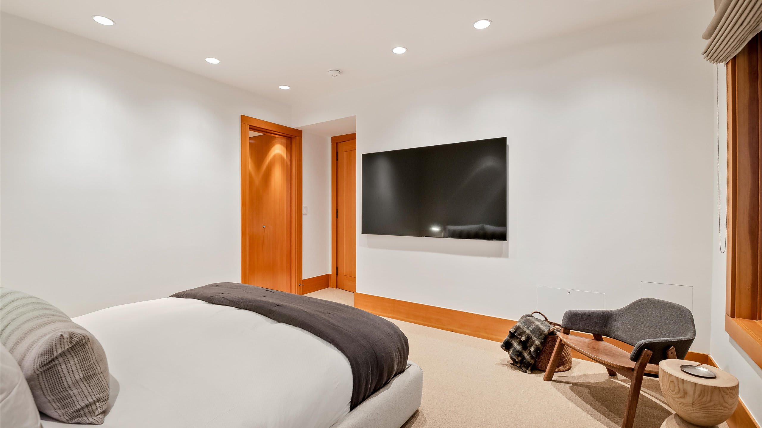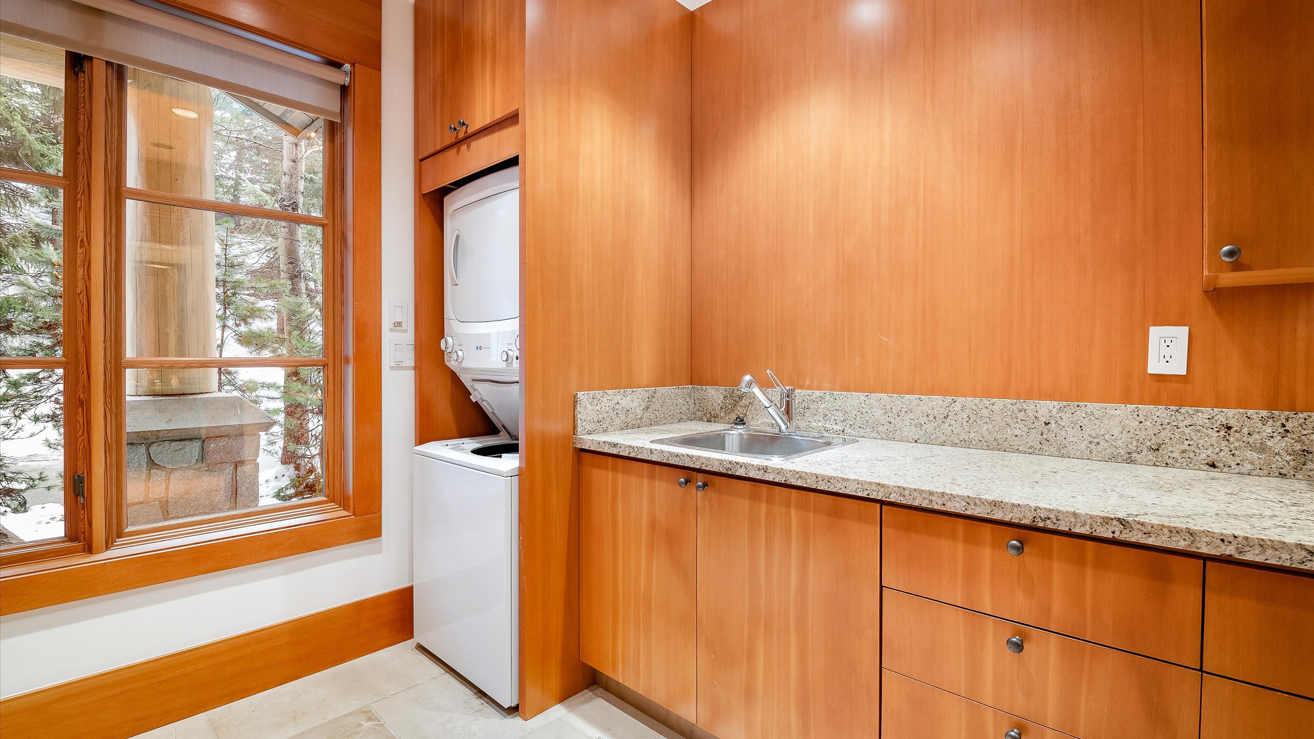 Spread across three levels, this standalone chalet balances shared gathering areas with moments of privacy. The open-plan main living area is centered around a striking stone fireplace and expansive windows framing the wilderness outside. A media room with a projector and gas fireplace offers another inviting place to relax after skiing, while the home’s heating, air conditioning, and portable fans provide comfort through every season.