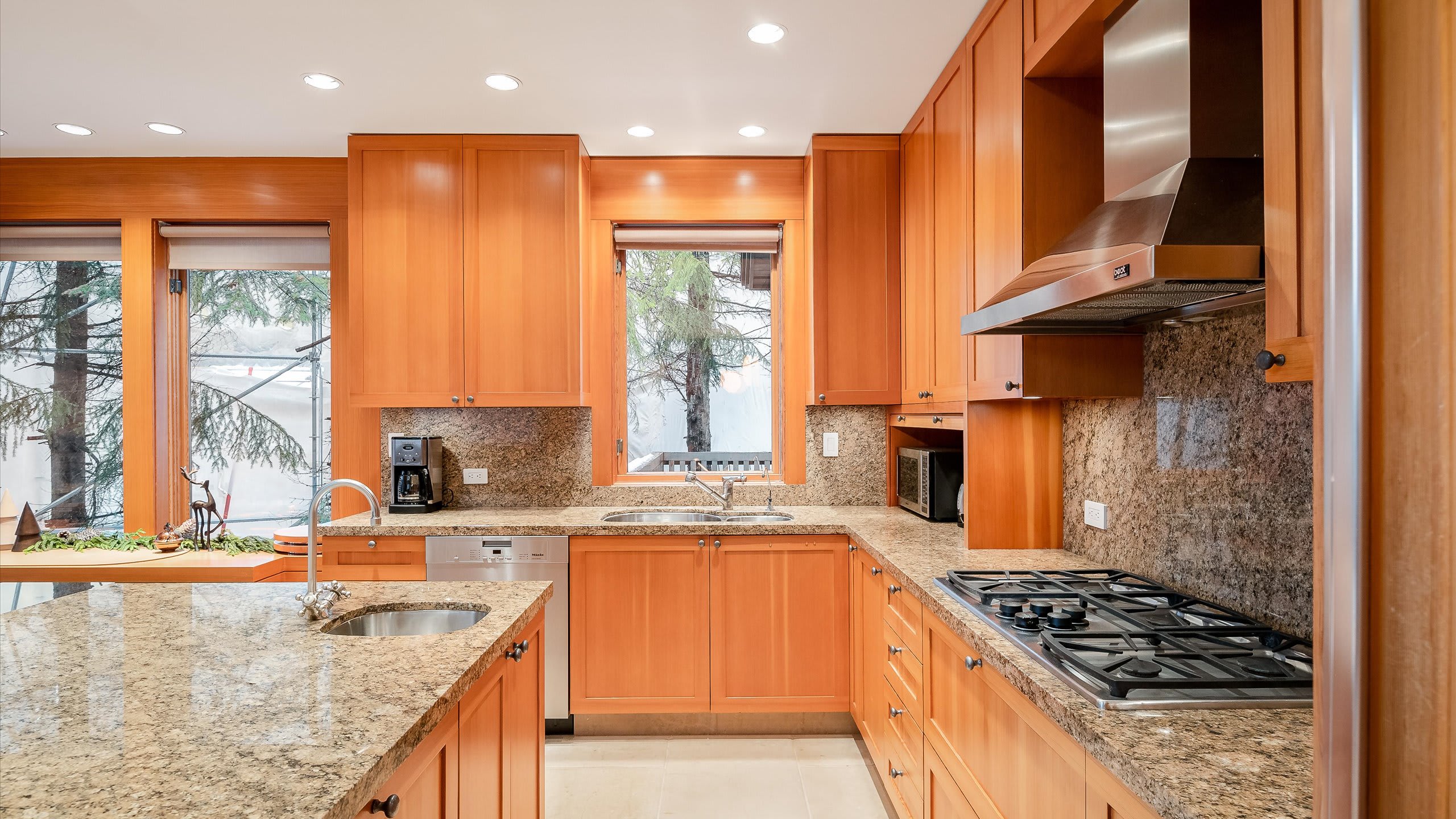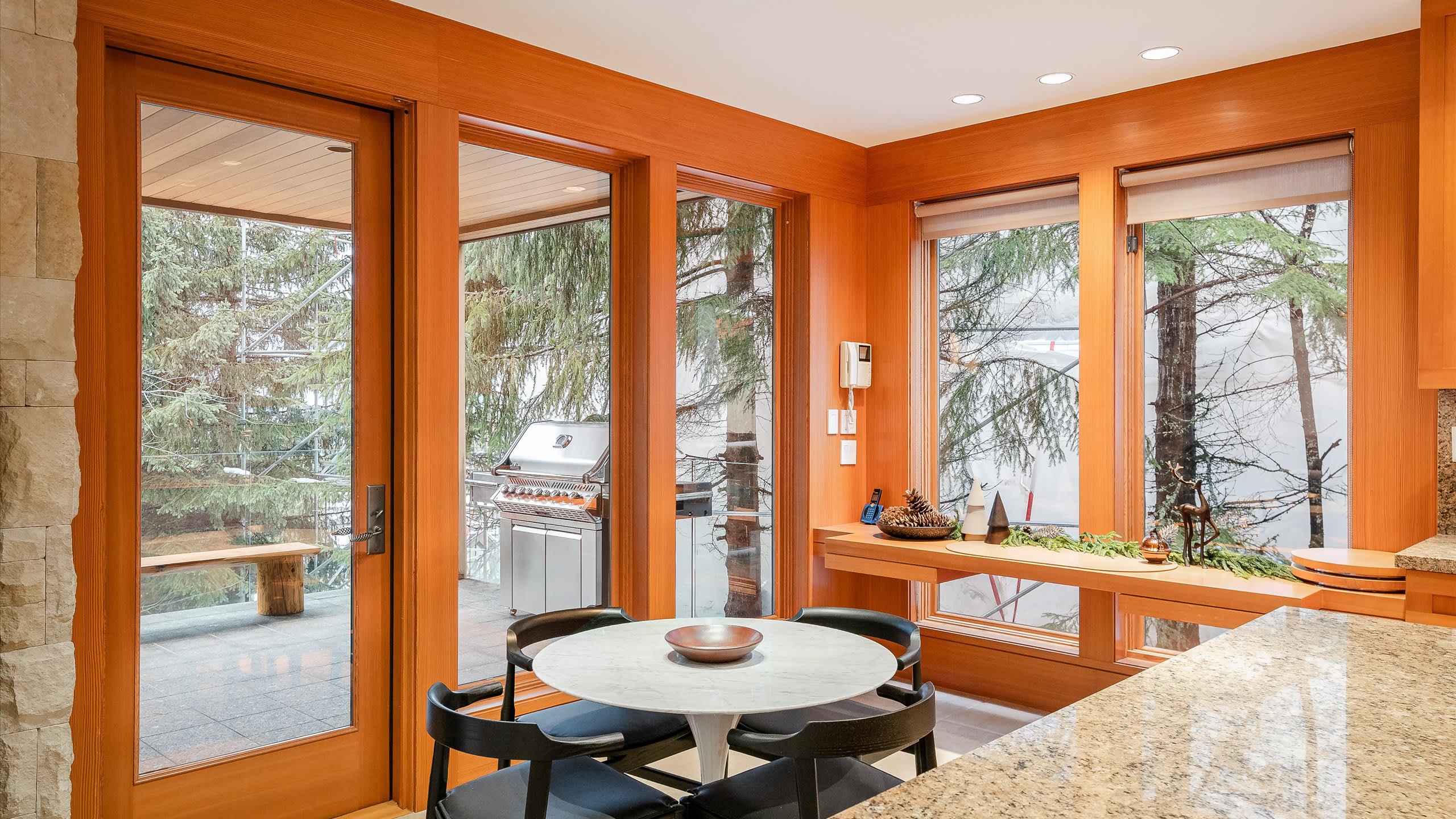 The kitchen is equipped for both everyday meals and group celebrations, with a center island, double ovens, and a dishwasher. Just off the kitchen, the dining area seats 8 guests comfortably, creating a natural setting for slow breakfasts before the gondola or cozy dinners after a day in the snow.
