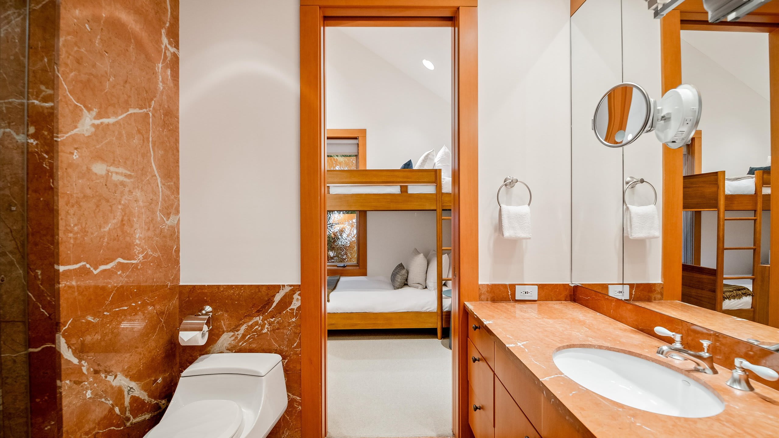 On the lower level, the third bedroom includes a Tribunk with an ensuite, while the fourth bedroom offers a king bed with access to the hot tub deck and a private ensuite. The fifth bedroom has a king bed, fireplace, reading nook, and an ensuite.