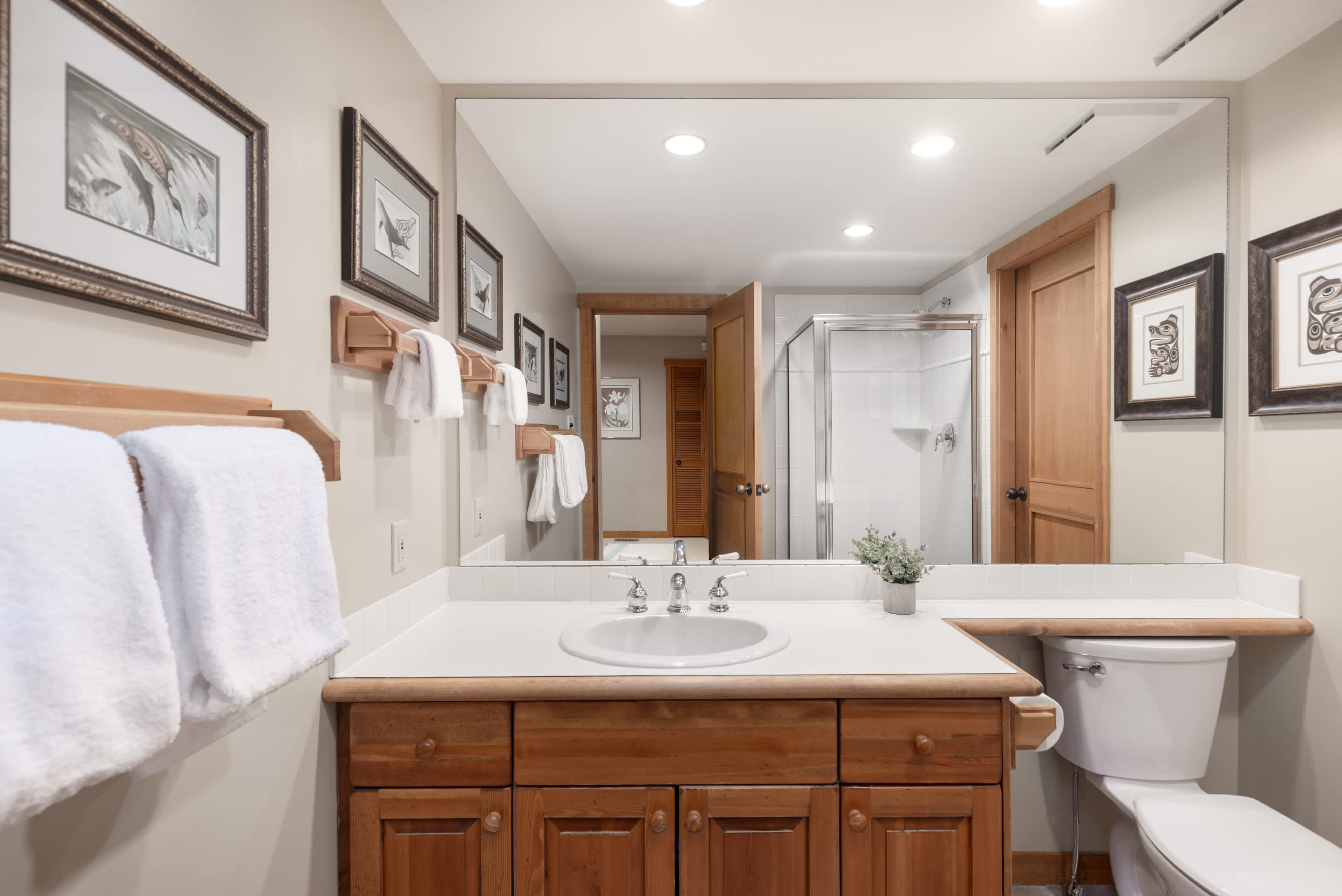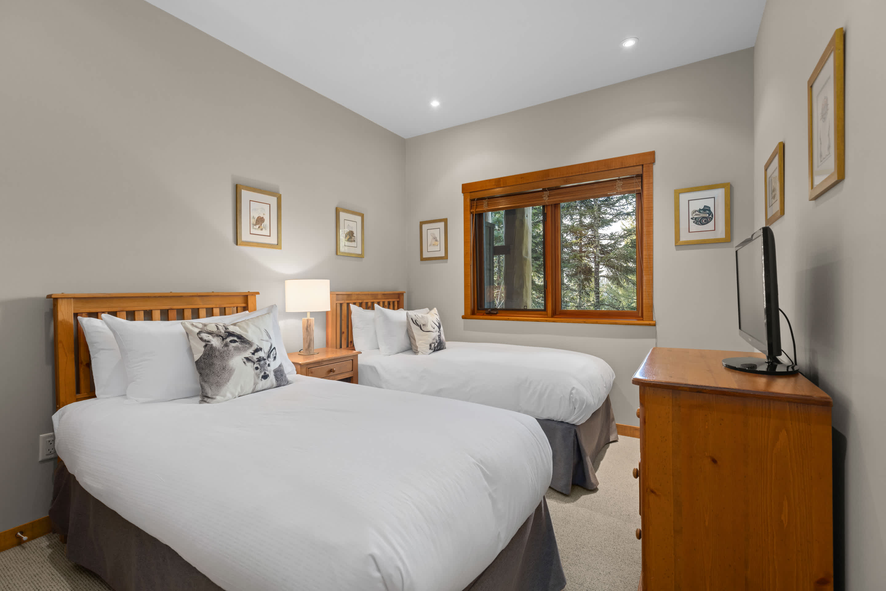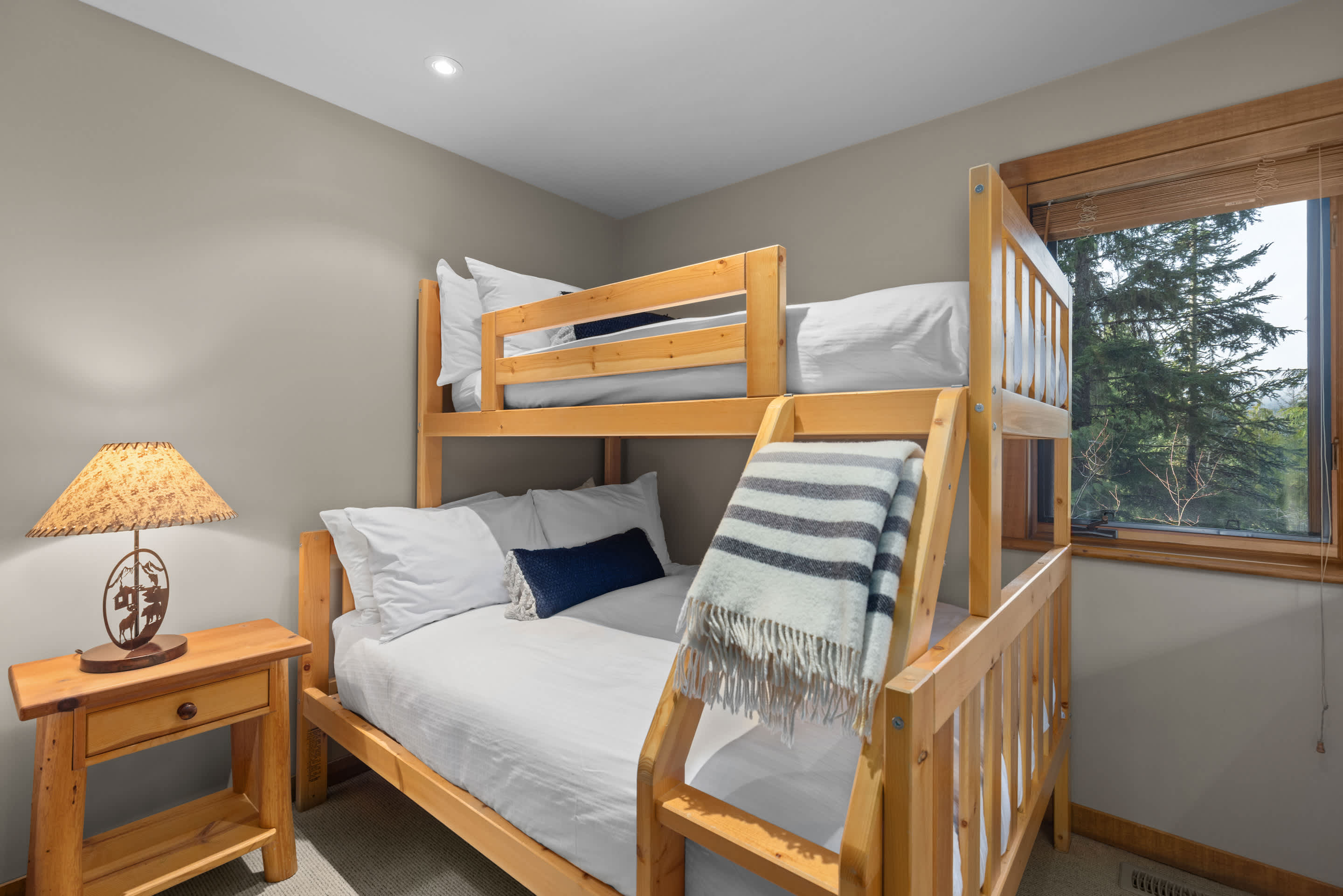 This townhouse accommodates up to eight guests across four bedrooms and 3.5 baths. The primary bedroom on the upper level features a king bed, gas fireplace, TV, walk-in wardrobe, and an ensuite bathroom with floor heating, a bathtub, glass-enclosed shower, and double vanity. A second bedroom on this level offers a queen bed and its own private ensuite with bathtub and shower. Downstairs, one bedroom is furnished with two twin beds, while another includes a tri-bunk with a double and single bed. A separate bathroom with a glass-enclosed shower and single vanity serves the lower level, and a powder room on the main floor adds convenience.