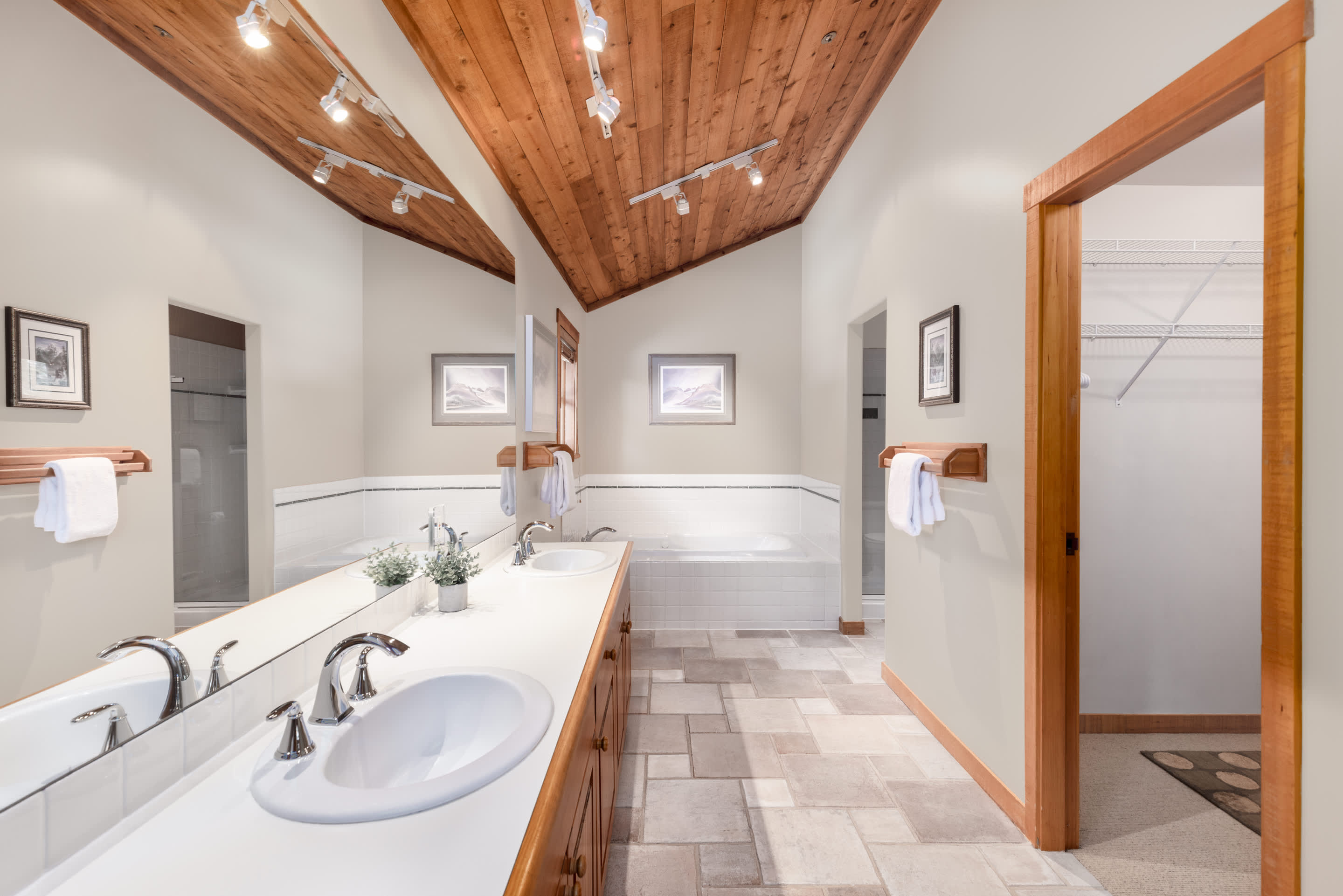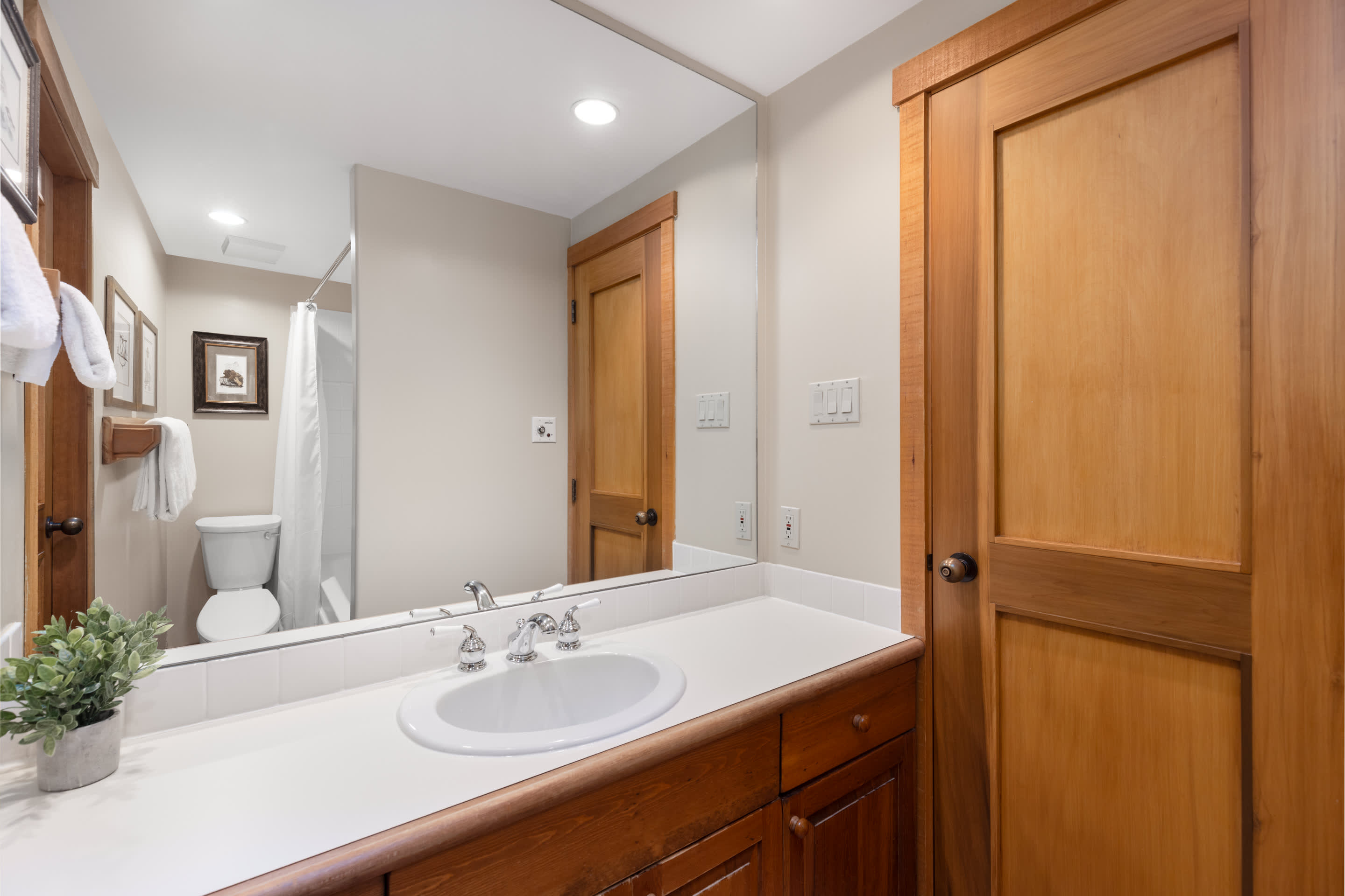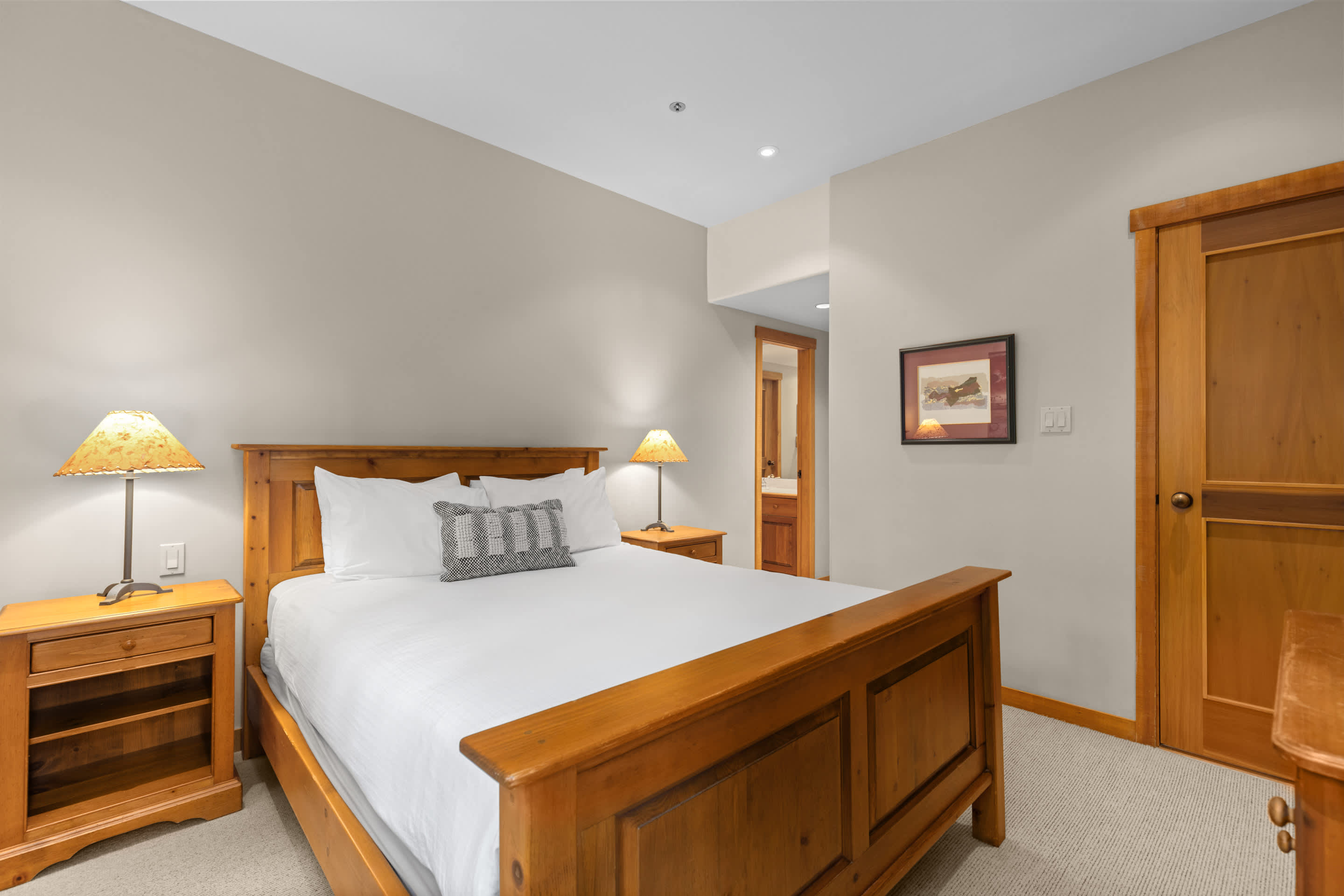 This townhouse accommodates up to eight guests across four bedrooms and 3.5 baths. The primary bedroom on the upper level features a king bed, gas fireplace, TV, walk-in wardrobe, and an ensuite bathroom with floor heating, a bathtub, glass-enclosed shower, and double vanity. A second bedroom on this level offers a queen bed and its own private ensuite with bathtub and shower. Downstairs, one bedroom is furnished with two twin beds, while another includes a tri-bunk with a double and single bed. A separate bathroom with a glass-enclosed shower and single vanity serves the lower level, and a powder room on the main floor adds convenience.
