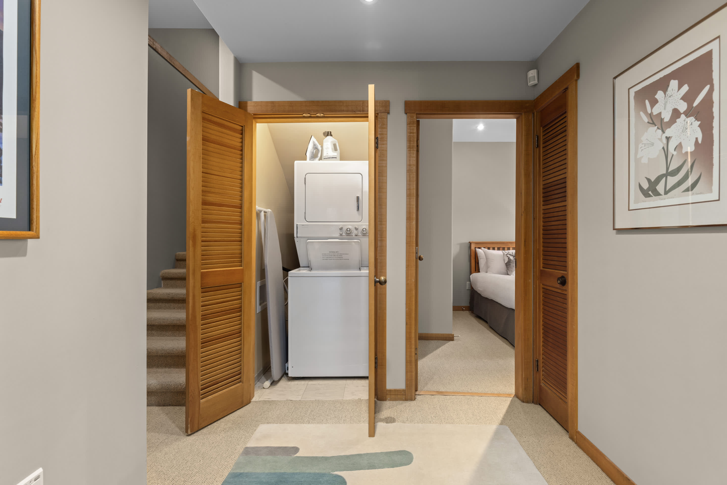 The kitchen provides space for preparing meals at home, equipped for cooking and gathering. A dining table seats eight guests, ideal for relaxed dinners after a day outdoors. A washer and dryer in unit add practicality for ski trips or extended stays.