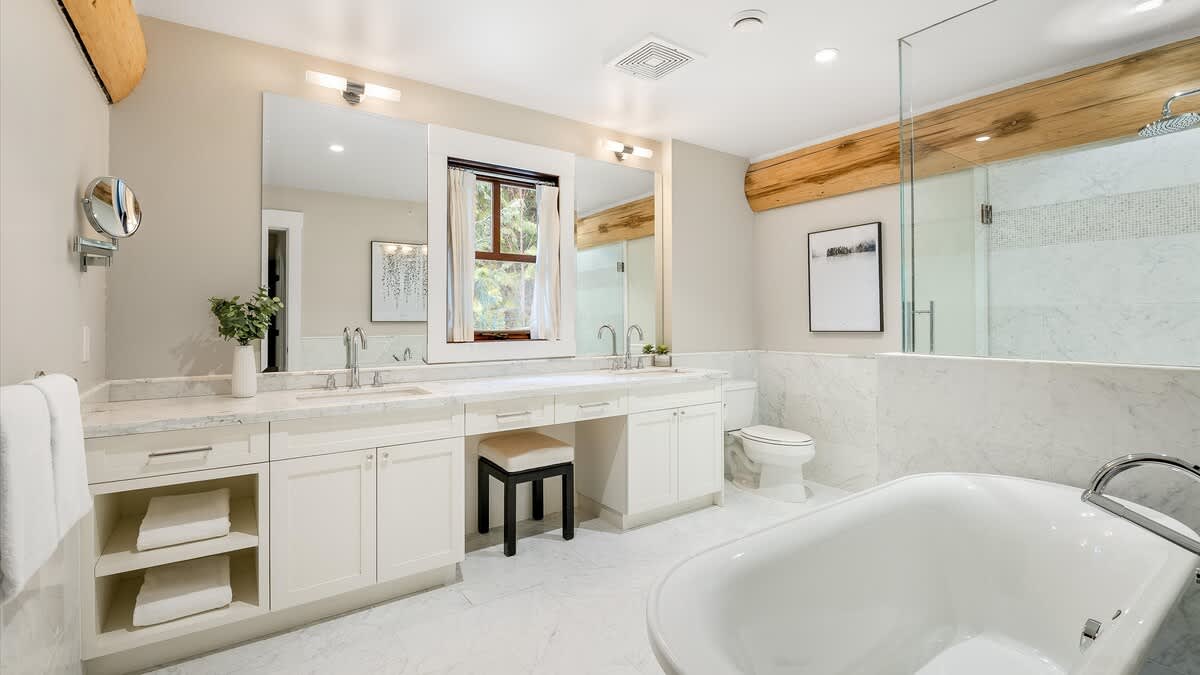 Four bedrooms across three levels accommodate up to eight guests. The primary suite occupies the upper floor and features a king bed, walk-in wardrobe, private balcony, and a 4-piece ensuite with a freestanding tub, shower, and double vanity. On the lower level, a second bedroom includes a king bed and an ensuite with a tub and shower combo. Nearby, one queen bedroom opens to the hot tub area, while another queen bedroom offers generous storage. A shared jack-and-jill bathroom with a double vanity and step-in shower serves the lower bedrooms, and an additional half bath is located on the main level.