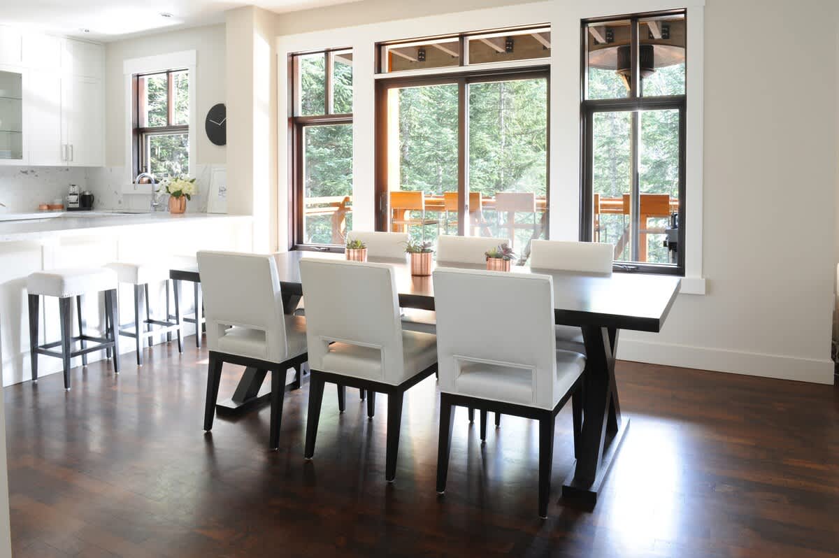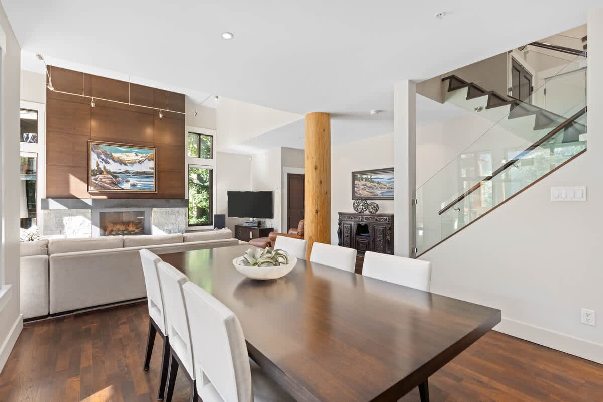 The main level brings together the living, dining, and kitchen areas in an open layout that feels welcoming after a day outdoors. Large windows frame winter mountain views while a gas fireplace and radiant in-floor heating keep the space comfortable. The dining table seats six, with additional seating for three at the breakfast bar, making it easy to gather for meals or conversation. Air conditioning is available on the upper floors when needed, and an HRV system supports year-round airflow.