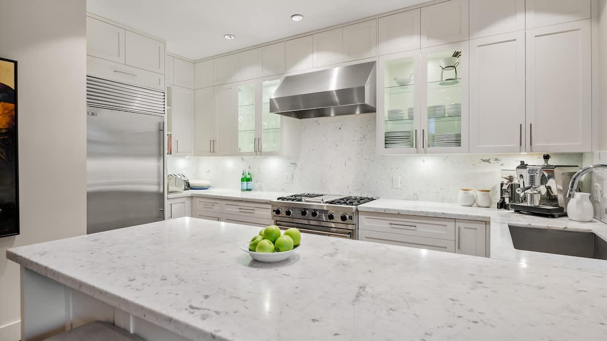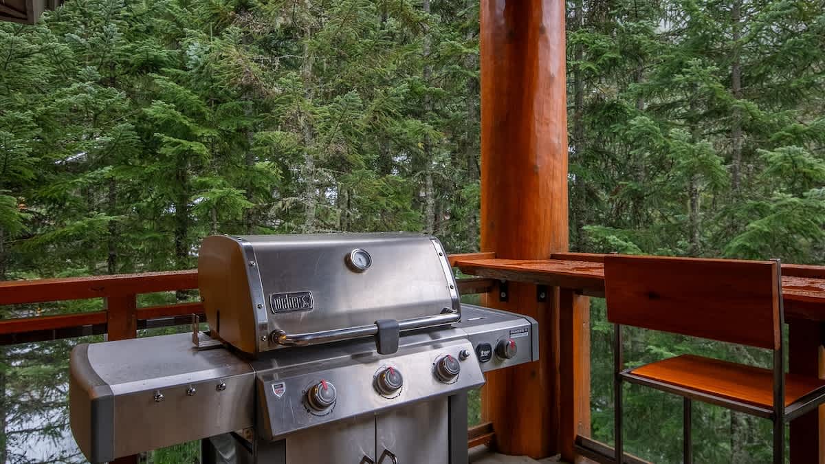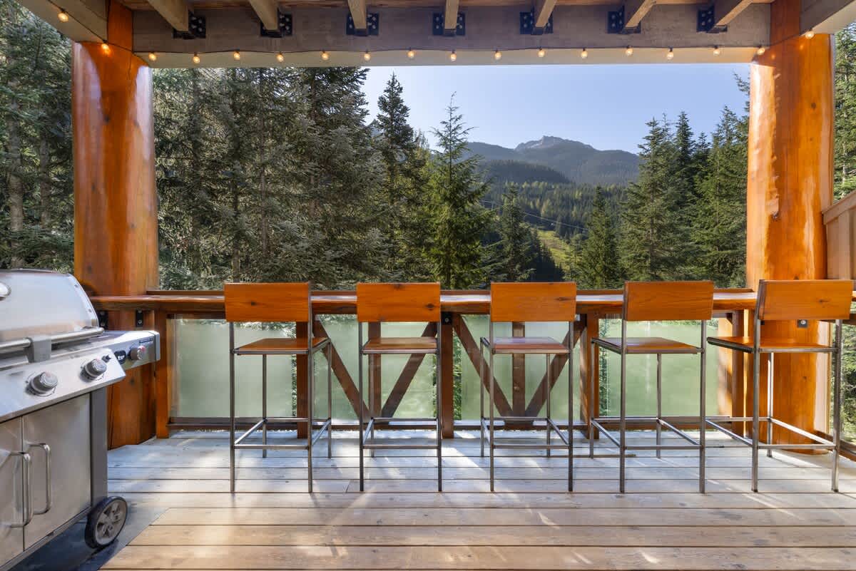 The kitchen is fully equipped for preparing meals at home, with stainless steel appliances and ample cabinetry. From this level, step onto the southeast-facing balcony where a long wild-edge bar looks toward Whistler Mountain, offering a quiet place to pause and take in the scenery when conditions allow.