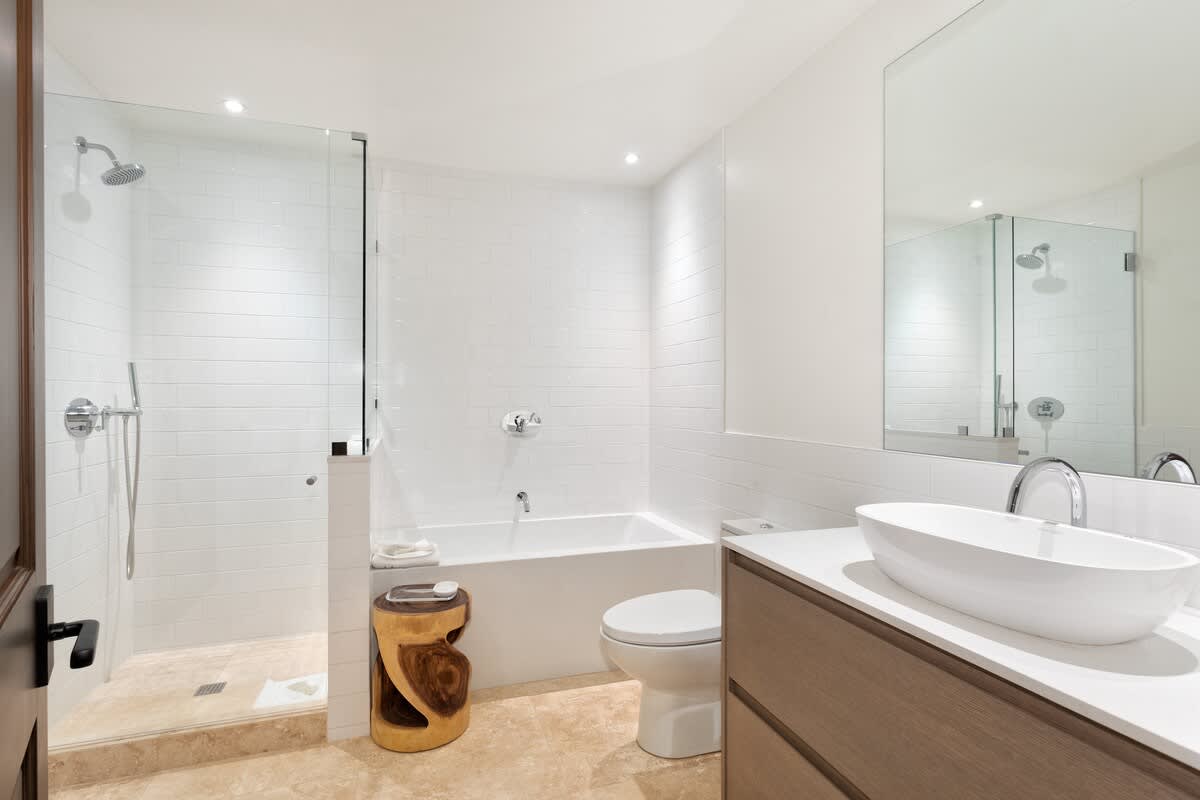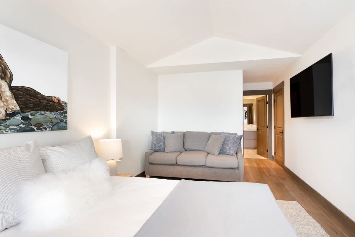 Four bedrooms are spread across the upper and lower levels for privacy and flexibility. Upstairs, two primary suites each open to their own balcony. One features a king bed, TV, and an ensuite with double vanity, deep soaking tub, and glass-enclosed shower. The second offers a queen bed, TV, and an ensuite with double vanity and shower.