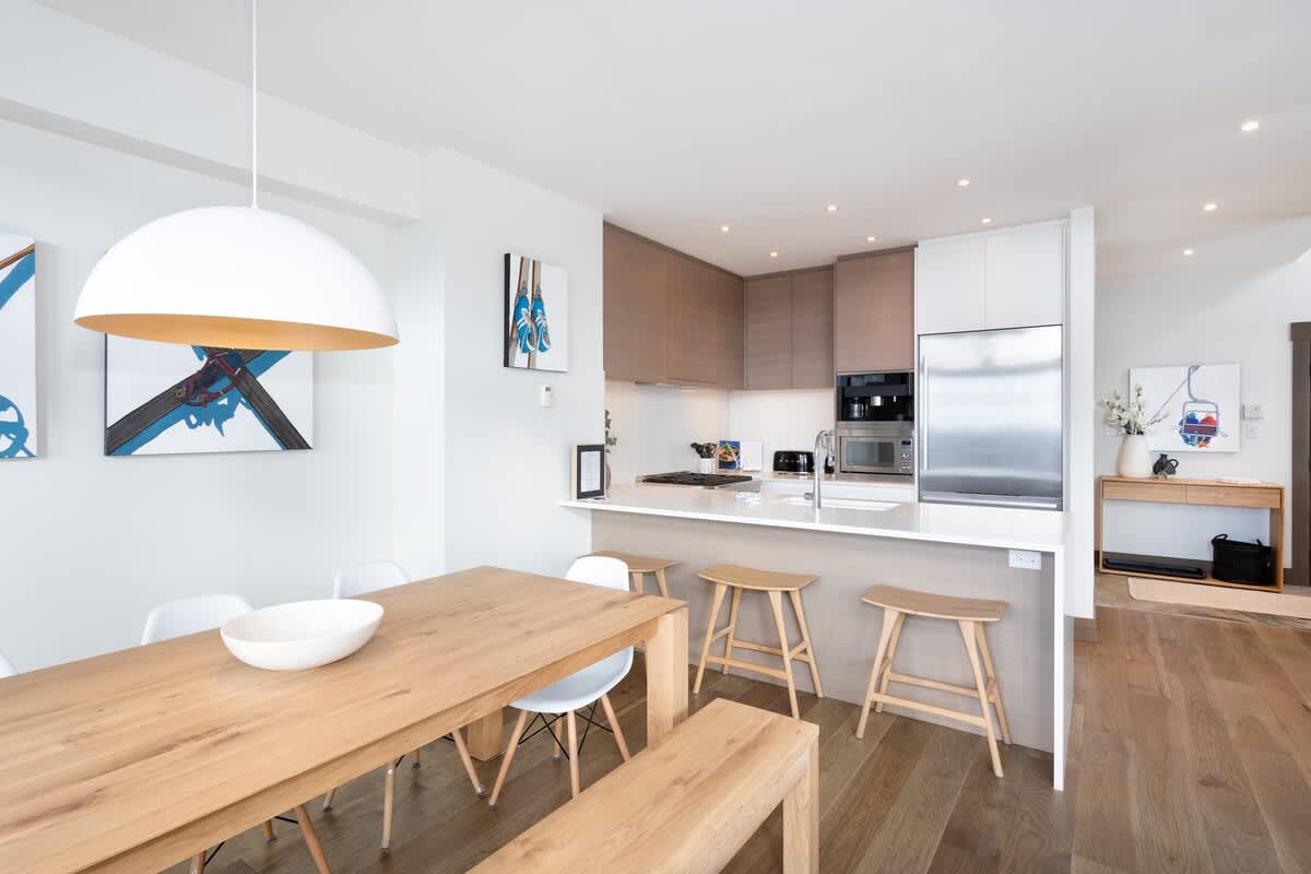The kitchen is set up for easy, shared meals, with ample counter space and everything needed to cook and dine in. A dining table seats eight for unhurried breakfasts or dinners, complemented by a breakfast bar with seating for casual moments. Step out to the adjacent balcony between meals, where outdoor furniture and a BBQ create a simple extension of the dining space, weather permitting.