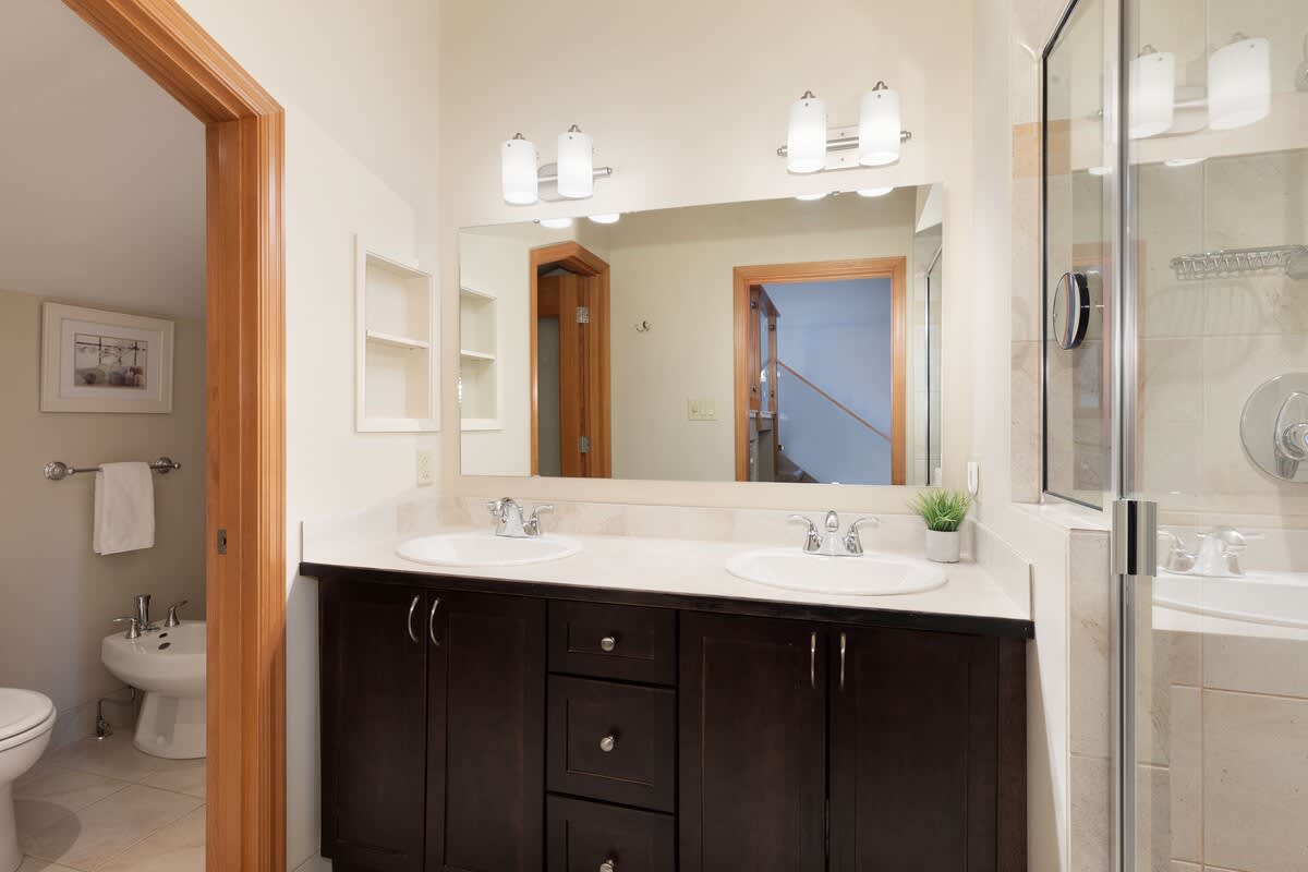 Four bedrooms are spread across multiple levels, offering privacy and flexibility for groups. The upper-level primary bedroom includes a queen bed, sitting area, TV, and an ensuite bathroom with a double vanity, glass-enclosed shower, and bidet. On the lower level, one bedroom features a queen bed and TV, another includes a king-split bed with an armchair, and the fourth bedroom offers a tri-bunk with a vanity. A bathroom with a deep soaking tub and overhead shower serves this level, while an additional bathroom with a glass-enclosed shower is located on the main floor.