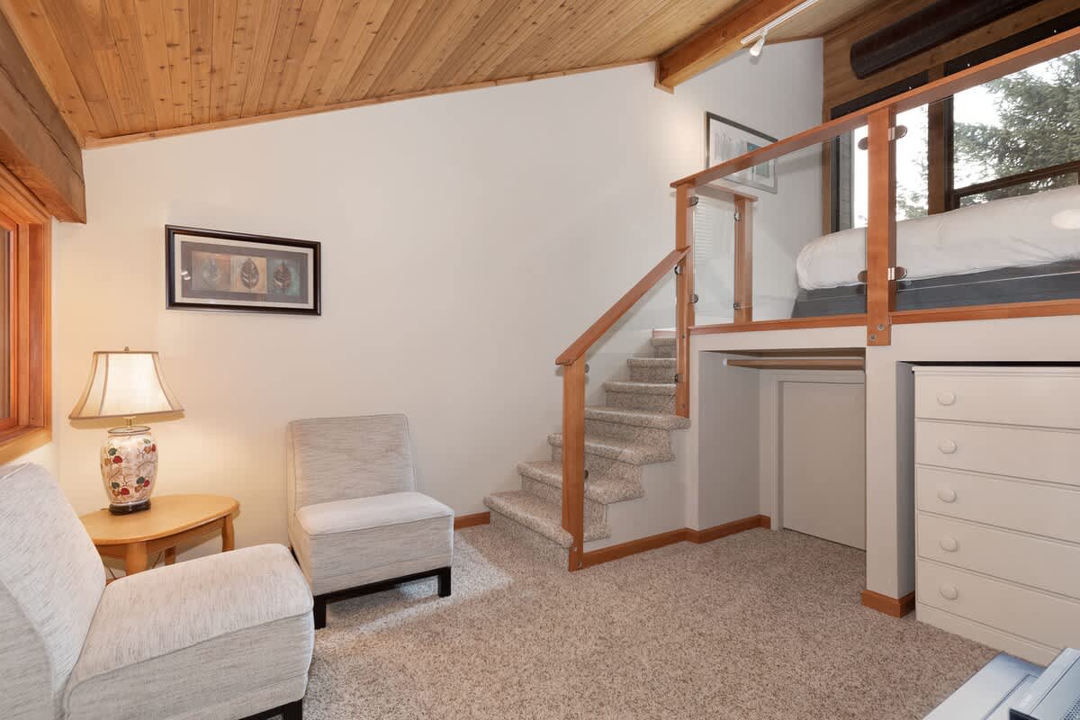 The main level is shaped for unwinding between adventures. Vaulted ceilings and large windows bring in winter light, while the living area centers around an indoor fireplace and TV for relaxed evenings in. A reading nook with armchairs and a chess table offers a quieter corner, and the layout flows easily between lounging, dining, and shared moments.