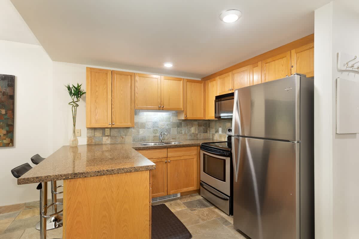 Set within Woodrun Lodge in the Upper Village, this single level condo offers direct ski access from the rear of the property - typically available from late December through March, depending on snow conditions. An elevator provides easy access within the building, and free parking garage on premises makes arrivals simple in any weather. After a day on the mountain, you can slip into the shared outdoor pool - heated year-round - or relax in the shared hot tub surrounded by snow-dusted trees. A gym and 24-hour building staff add to the ease of your stay.