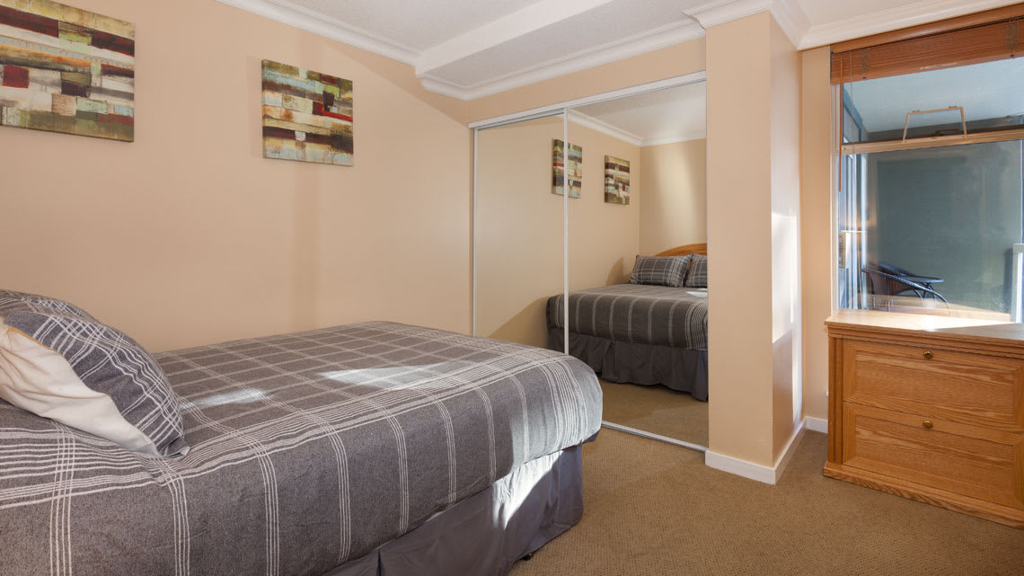 This condo sleeps 6 with 3 bedrooms, 4 beds, and 2 baths. The primary bedroom features a king bed, TV, large windows, a sitting area, and access to a step-out balcony. The ensuite bathroom includes a deep tub with an overhead shower. A second bedroom offers a queen bed and spacious closet. The den (no windows) includes both a double bed and a twin bed, providing a comfortable sleeping space for families or small groups. A secondary bathroom includes a glass-enclosed shower and single vanity.