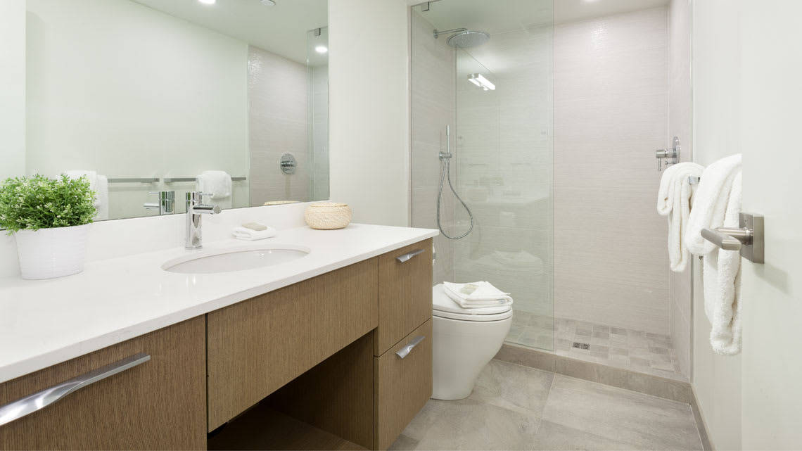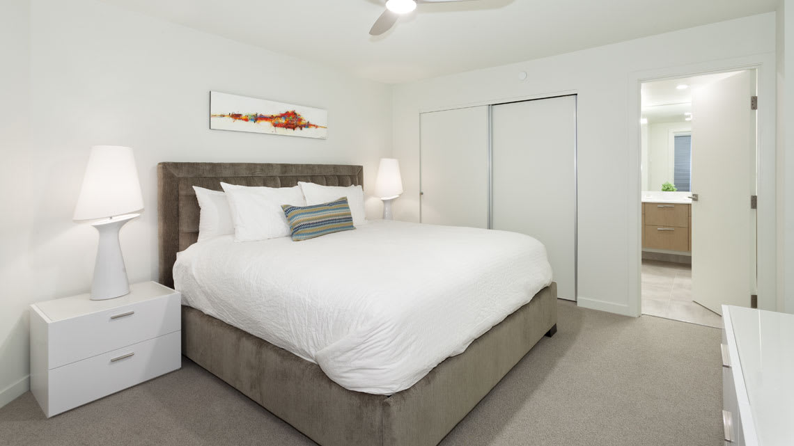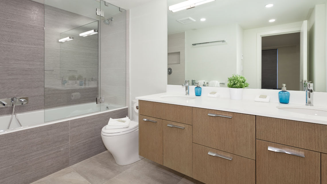 The primary bedroom features a king bed, TV, dresser, and an ensuite bathroom with a double vanity, soaker tub with shower, and heated floors. The second bedroom includes a king-split bed that can be arranged as one king or two twins, along with a wall-mounted TV. A second bathroom with a rain shower, single vanity, and heated floor provides added comfort and privacy.