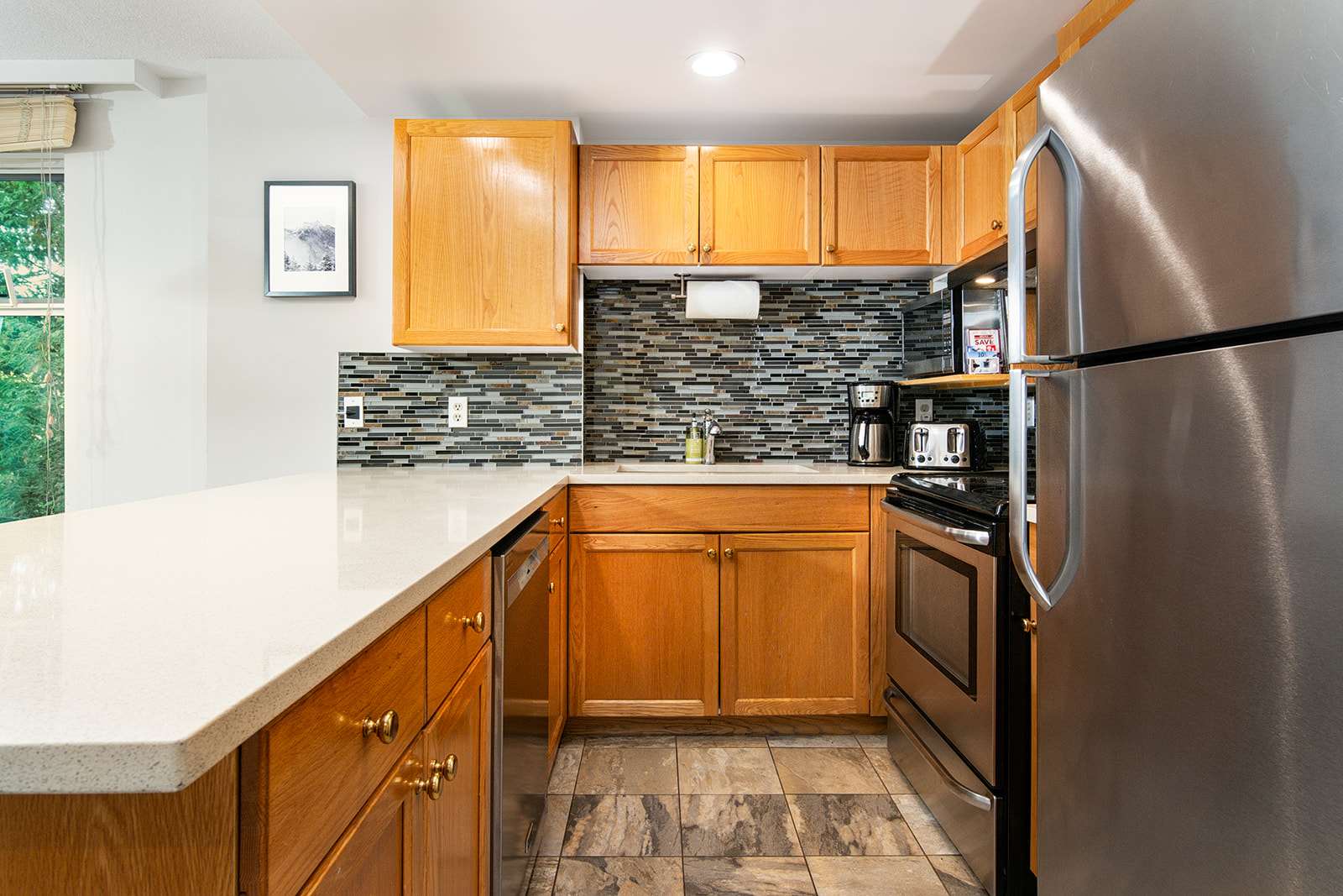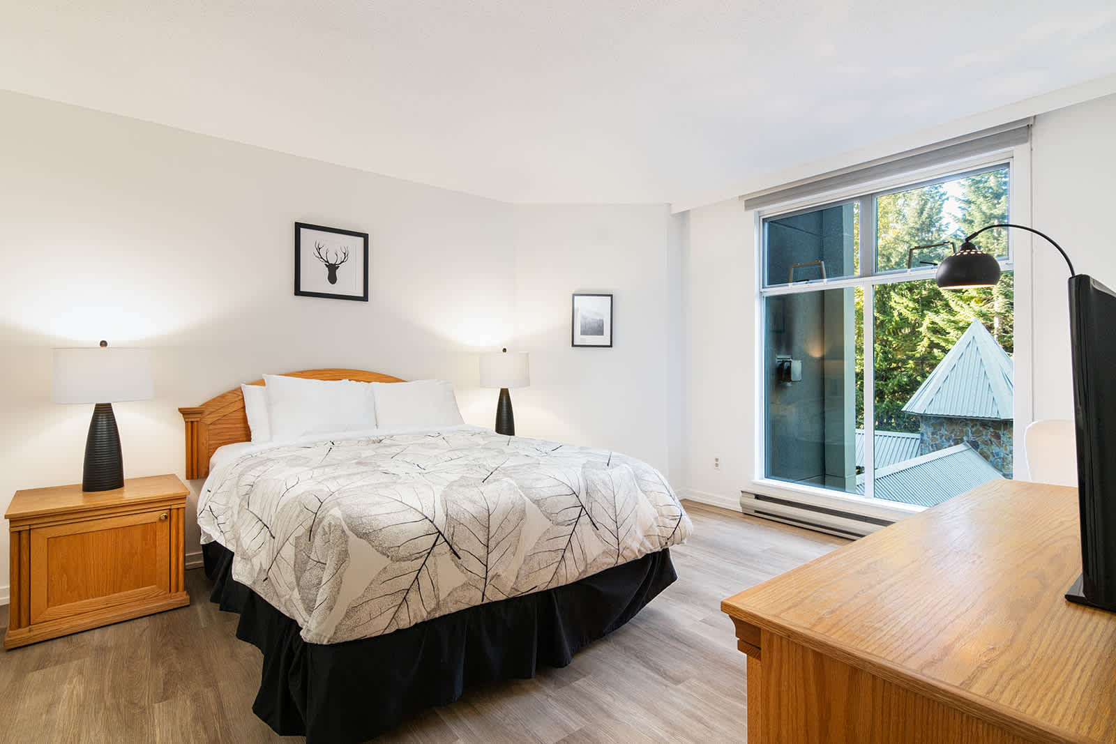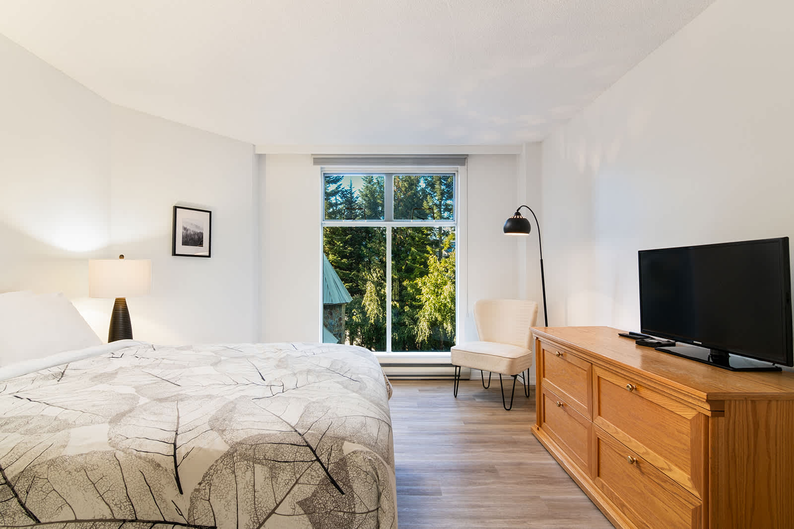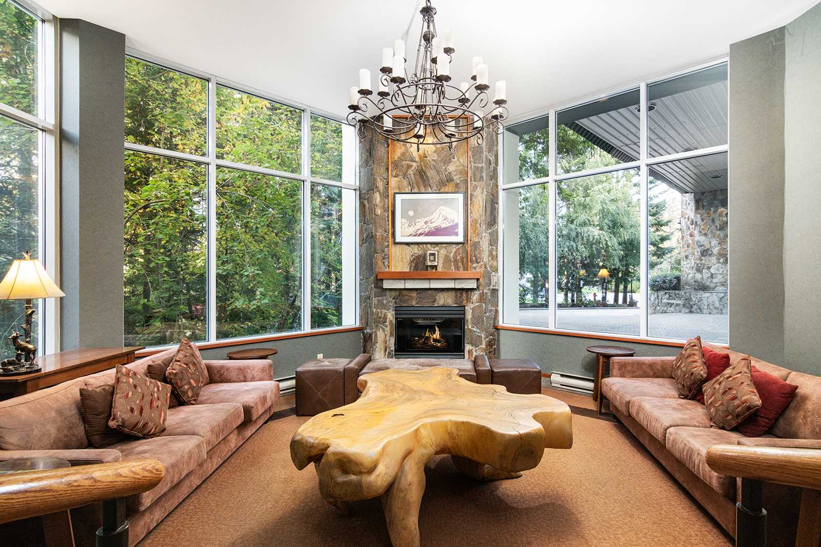 Spanning over 1,000 sq. ft., the home feels spacious and considered, with recently updated bathrooms and clean, modern finishes throughout. Large windows frame a peaceful forested setting, keeping you connected to the alpine landscape from every corner.