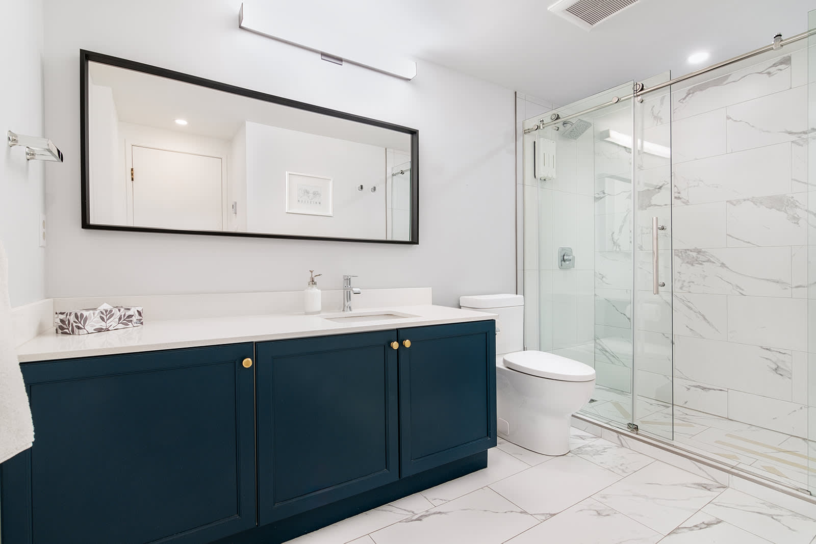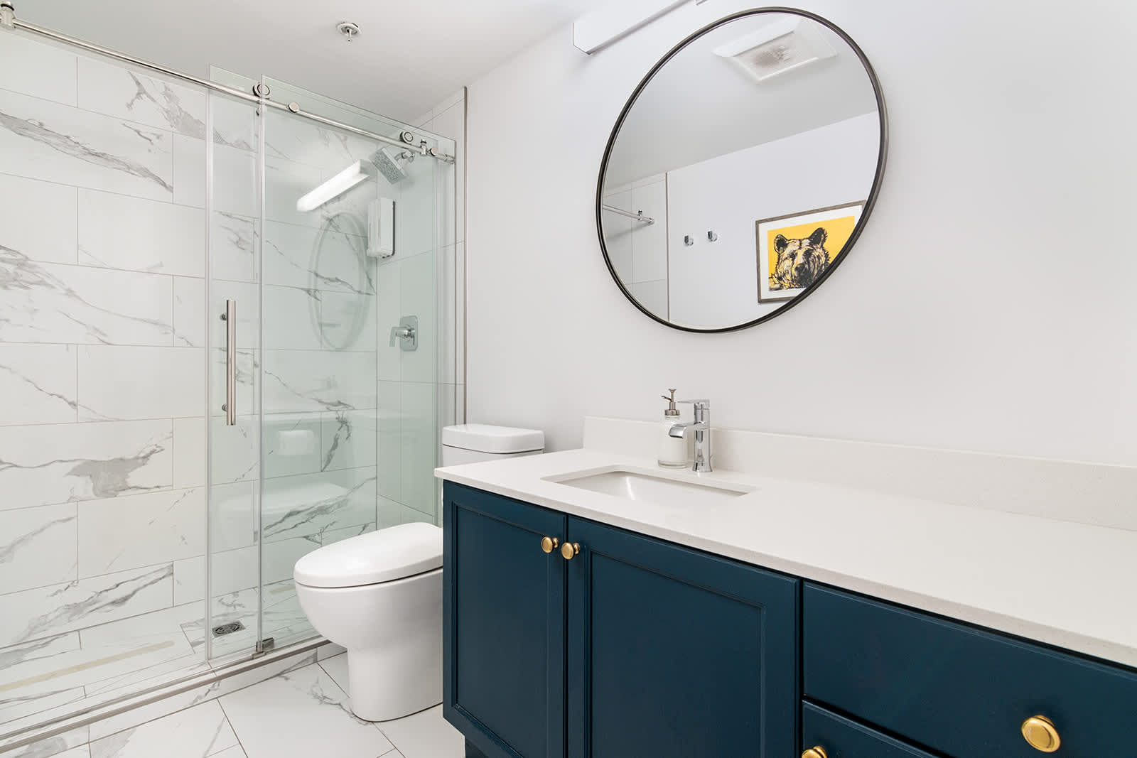 The condo sleeps 6 guests across two bedrooms. The primary bedroom features a king bed and a sleek ensuite bathroom with a glass-enclosed shower. The second bedroom offers a queen bunk bed, ideal for families or groups. A second bathroom with a glass-enclosed shower serves this room and the main living area. Bed linens, extra pillows and blankets, clothing storage, and in-unit washer and dryer provide added convenience.