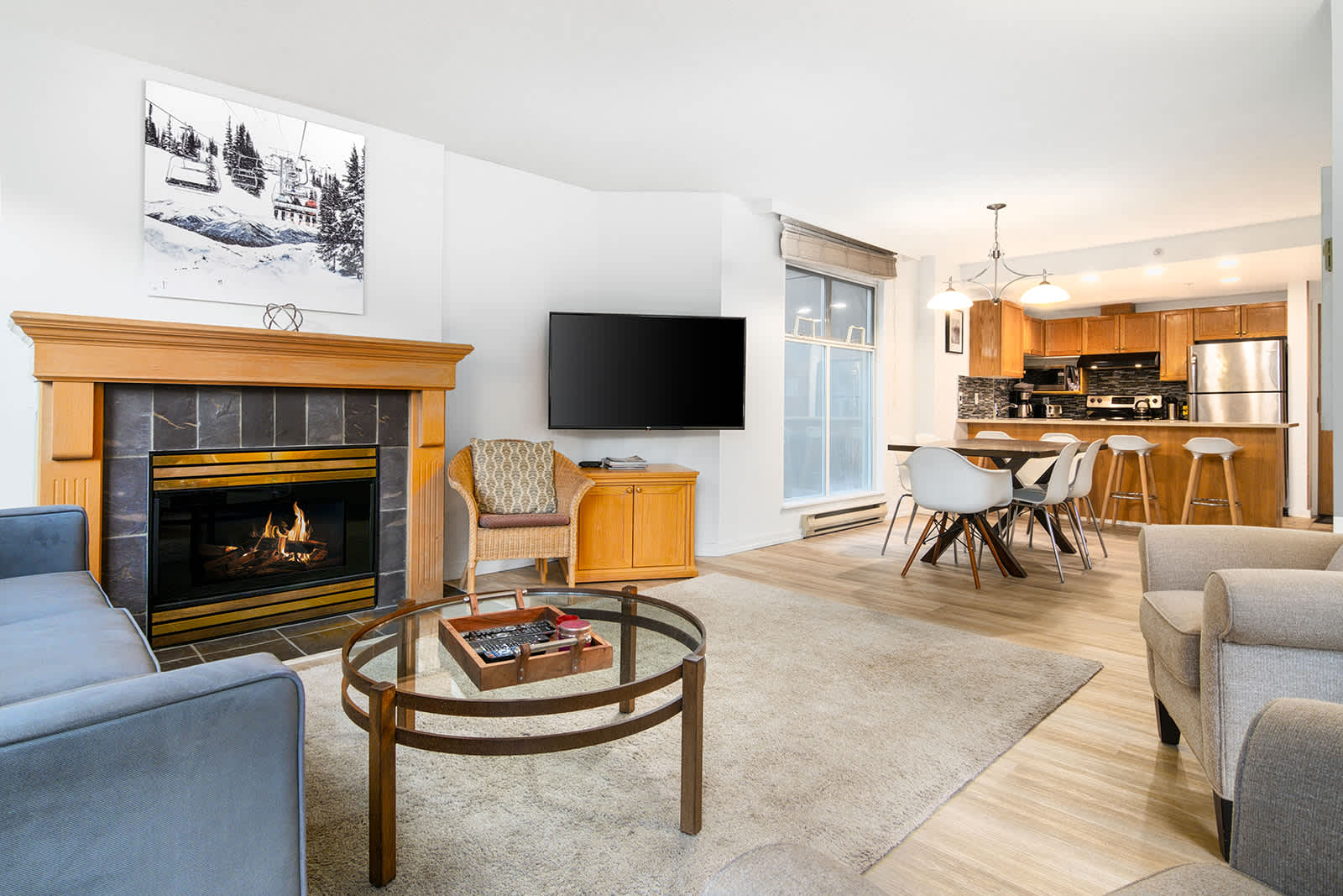 As snow settles quietly beyond the evergreens, return to a warm, inviting retreat. Skis stored, boots drying, and the fireplace casting a soft glow. This is where mountain days ease into relaxed evenings.