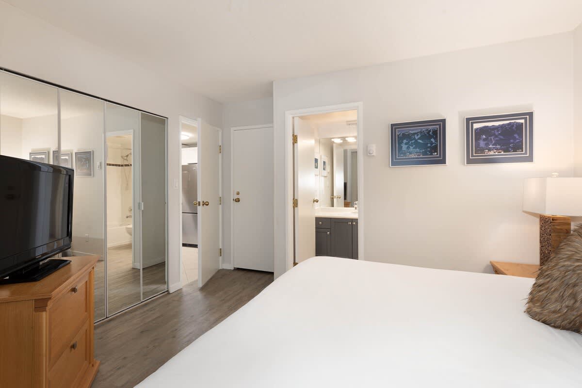 The primary bedroom features a king bed, TV, closet, and an ensuite bathroom with a bathtub and overhead shower. Just off the living area, the den provides a double bed for additional guests. This space is designed as a den and does not have an external window, offering a private sleeping area within the condo. A second full bathroom with a glass-enclosed shower is located nearby.
