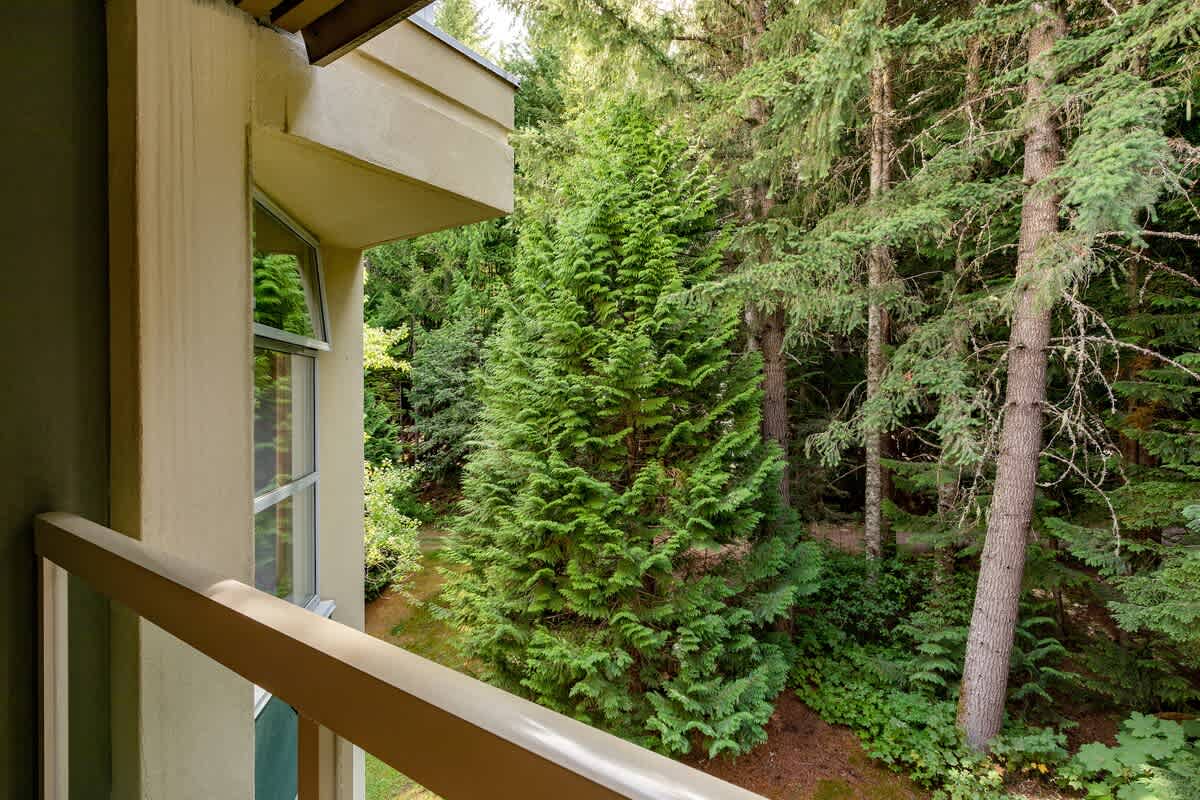 The condo is set within Woodrun Lodge and offers a one-bedroom plus den layout with two bathrooms, comfortably accommodating up to five guests. The living area centers around a cozy seating space with a gas fireplace and TV, ideal for winding down after skiing or exploring the village. Large windows and a private balcony look out onto the surrounding forest, adding a sense of seclusion while keeping you close to Blackcomb Mountain.