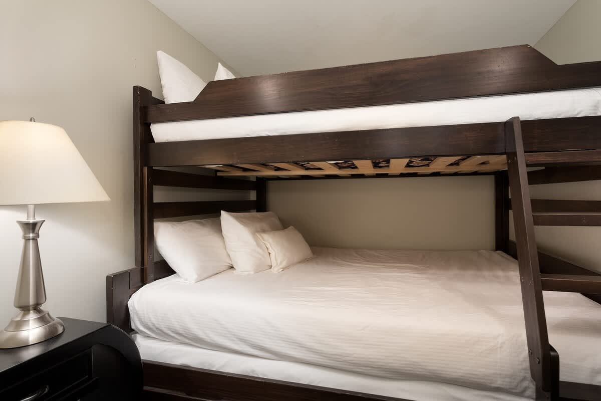 The primary bedroom features a king bed, TV, and peaceful forest views. Its ensuite bathroom includes a bathtub with a shower combination, offering a place to unwind at the end of the day. The den provides a tri-bunk with a double bed on the bottom and a twin above, well suited for families or small groups, while this space is designed as a den and does not have an external window, it offers a comfortable and private sleeping space. A second bathroom with a glass-enclosed shower adds flexibility and comfort for all guests.