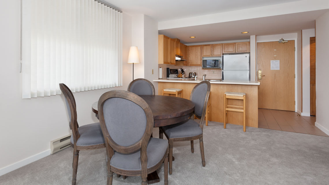 In-unit laundry, a dedicated workspace, WiFi, and secure parking in the garage add convenience for both short and longer stays. Self check-in is available, with building staff on hand if assistance is needed.