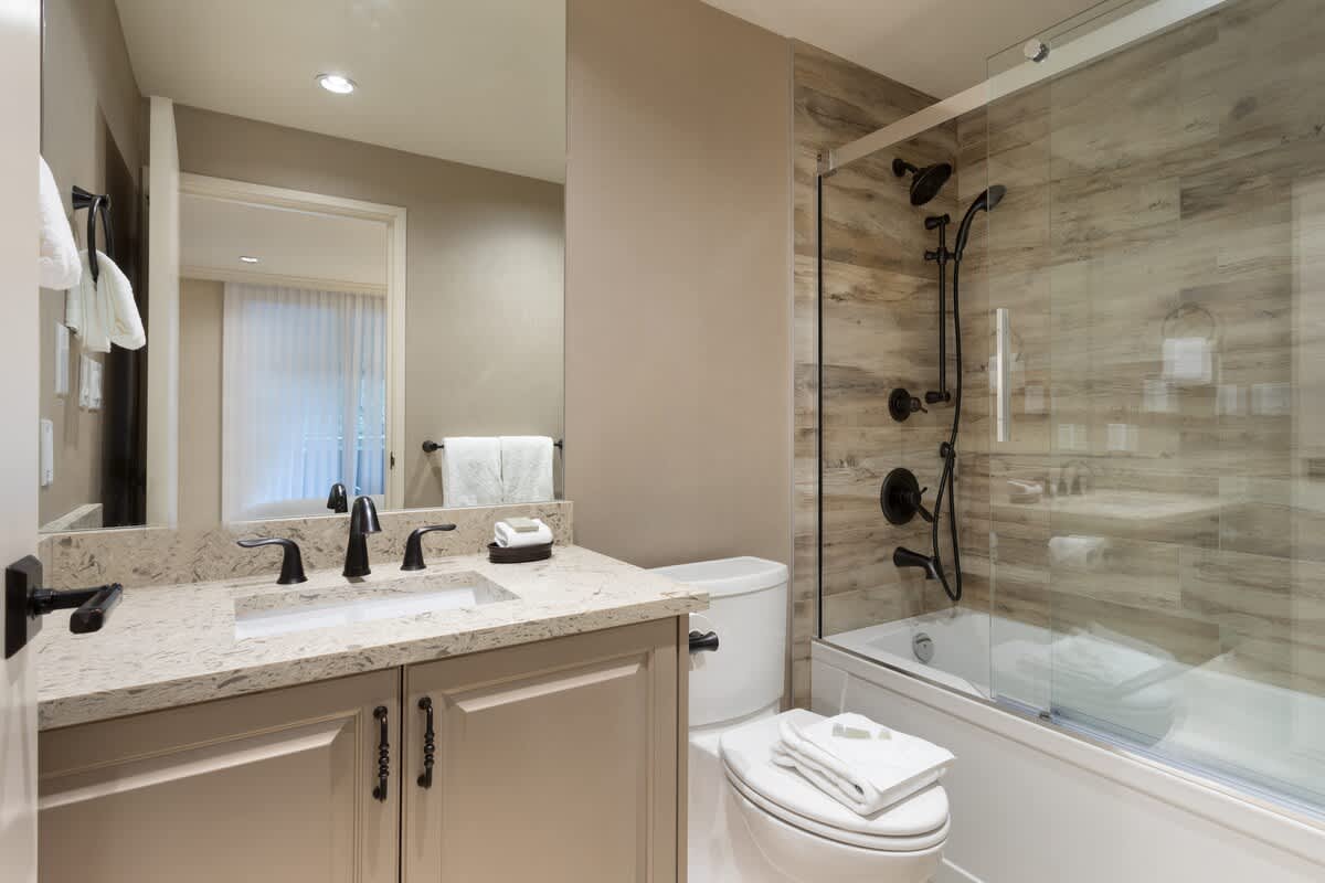 • The second bathroom features a single vanity and glass-enclosed shower