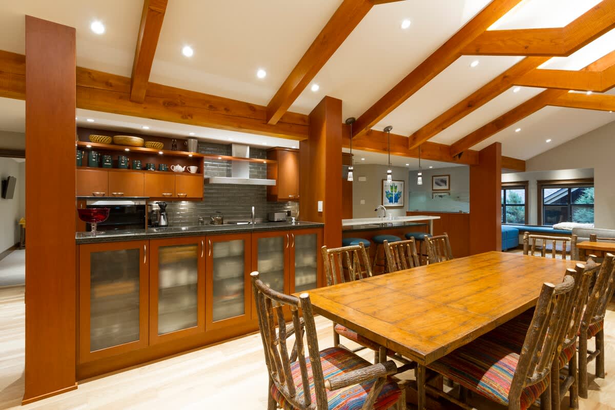 The open-concept kitchen supports shared meals and easy conversation, with heated floors and everything needed to cook comfortably during your stay. A dining table seats eight, with additional seating for three at the breakfast bar. Step out onto the deck between snowy adventures to use the BBQ or enjoy the crisp mountain air.