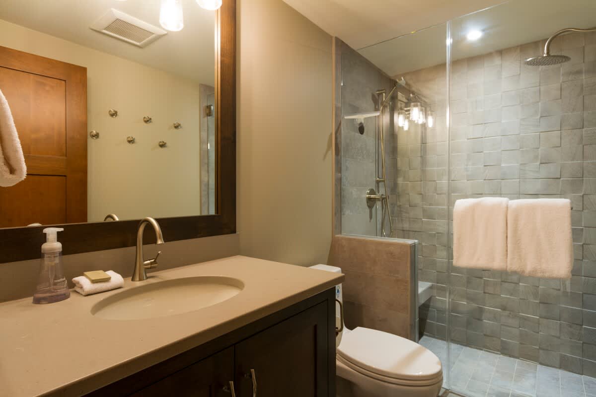 Downstairs, three additional bedrooms include one with a queen bed and TV, one with a king bed and TV, and a fifth bedroom with two bunk beds. Guests on this level share two bathrooms - one with a glass-enclosed shower and one with a bathtub and overhead shower.