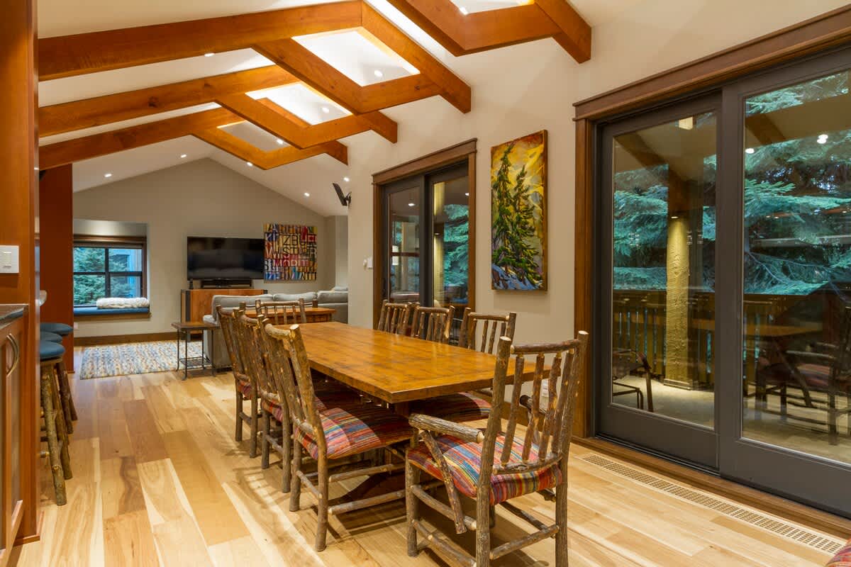 This entire townhouse is arranged across two levels, giving your group room to spread out. The main open-plan living area features vaulted ceilings, exposed beams, generous seating, a TV, and a wood-burning fireplace that naturally draws everyone in on cold nights. A second living area offers a wraparound couch with TV and DVD/VCR player, while a lower-level den adds another relaxed spot for reading or movie time.